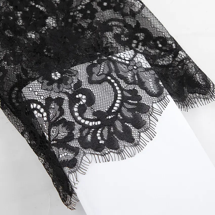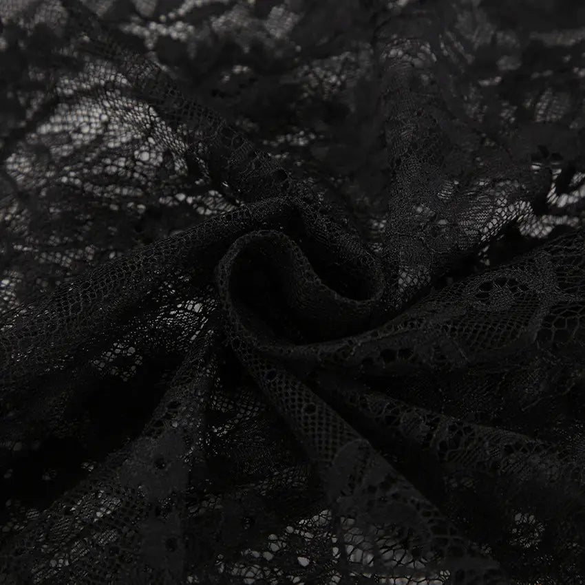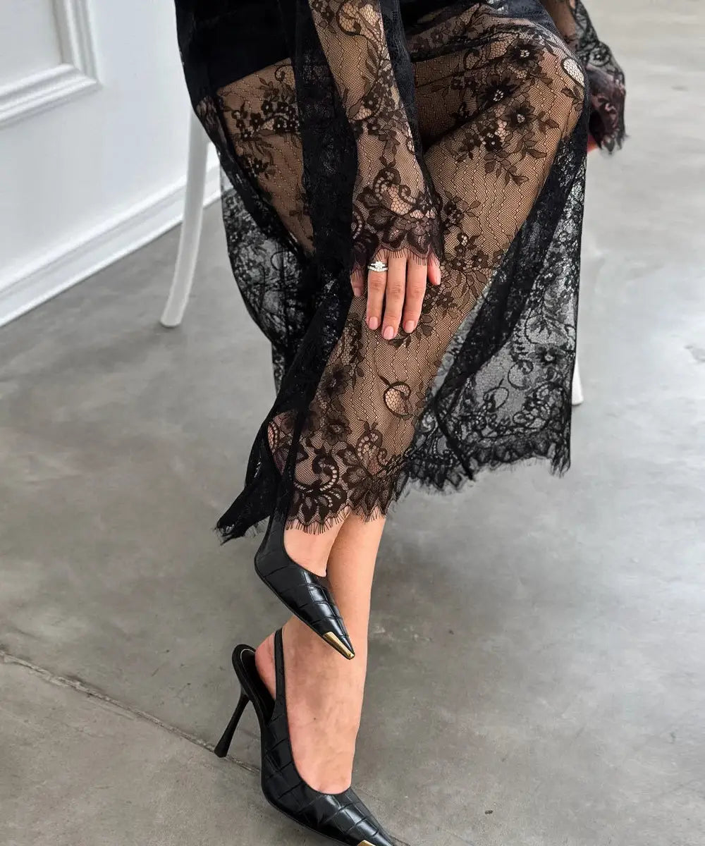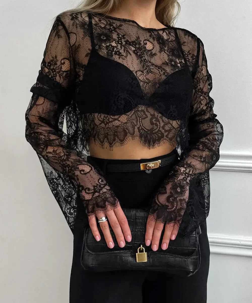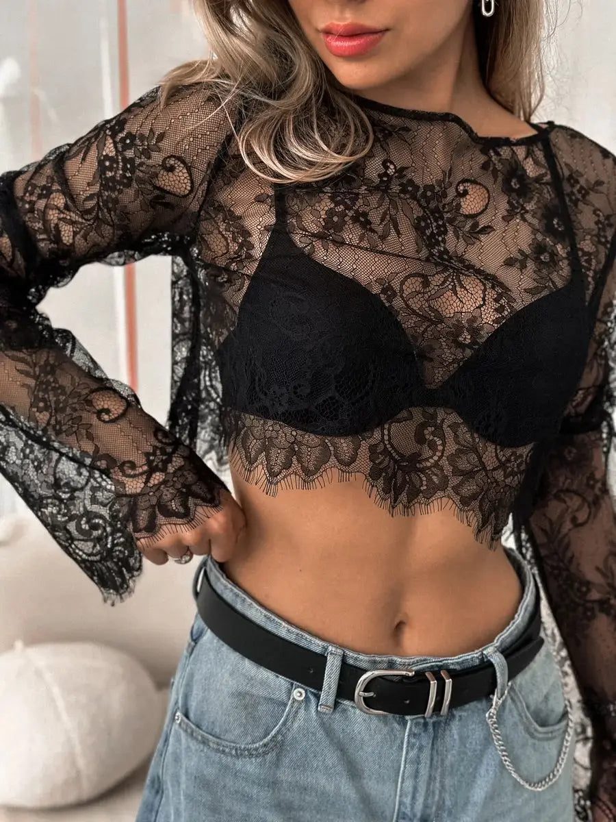 Schwarzer durchsichtiger Rockanzug aus Brokatspitze mit langen Ärmeln und Rundhalsausschnitt und hoher Taille