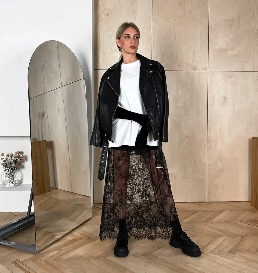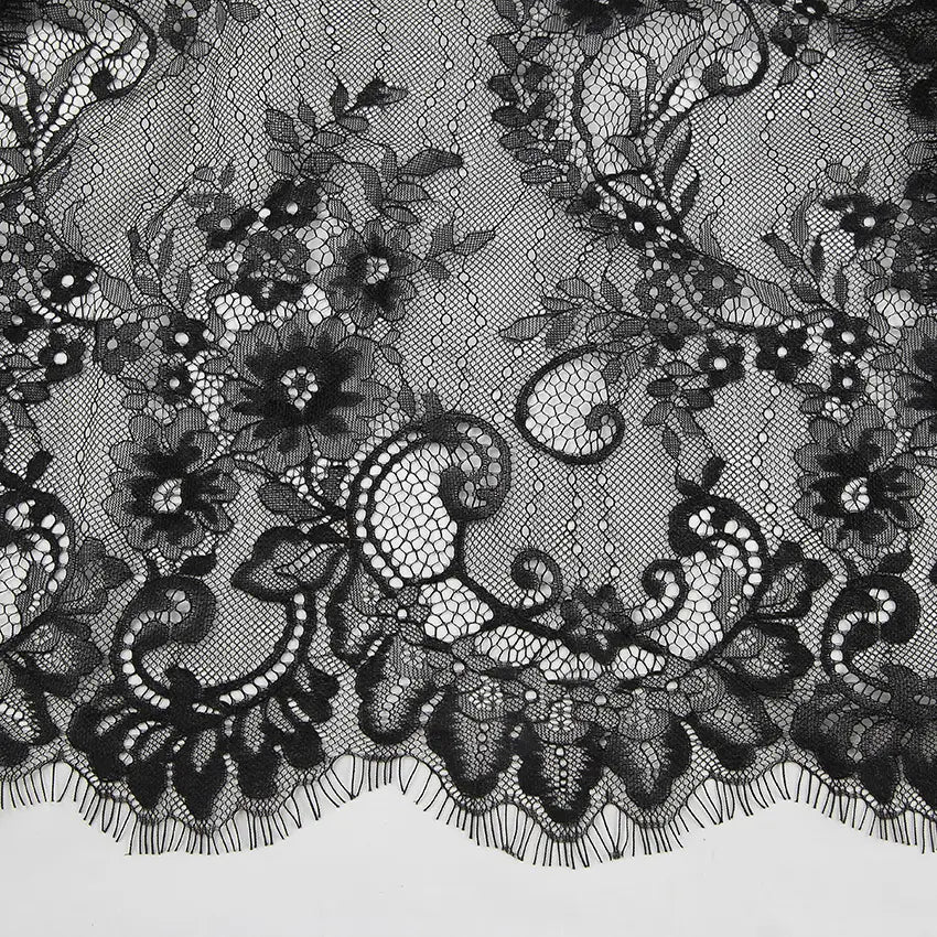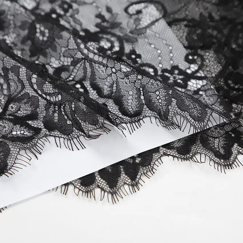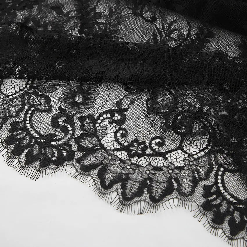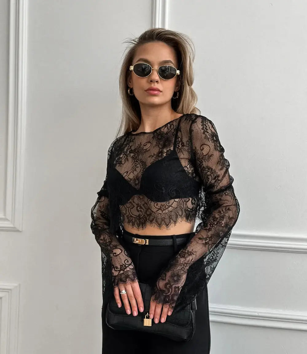 Schwarzer durchsichtiger Rockanzug aus Brokatspitze mit langen Ärmeln und Rundhalsausschnitt und hoher Taille