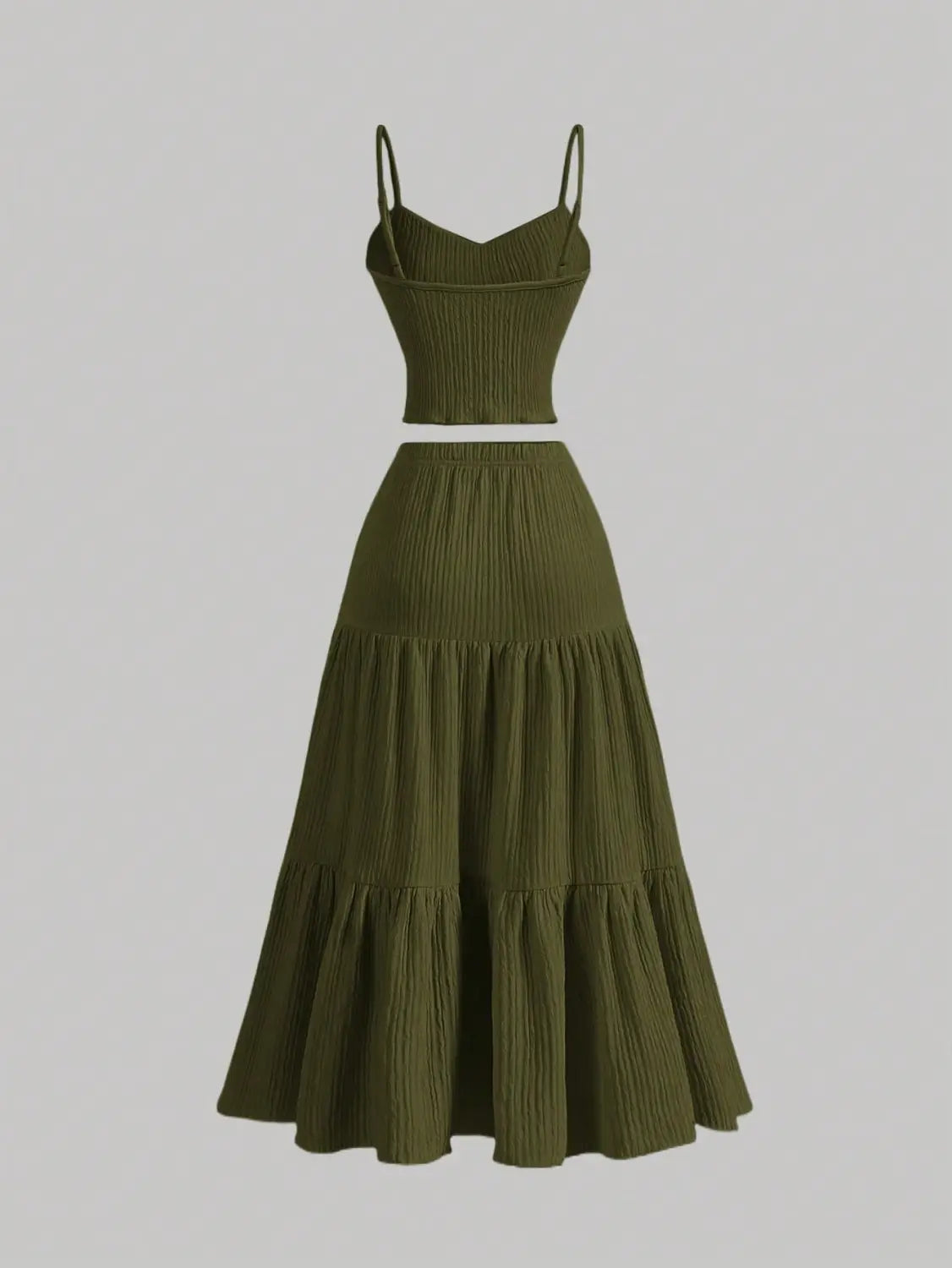 Casual Solid Color Ribbed Fit Vest Top And Ruched Hem A- Line Skirt - Green / L - Other