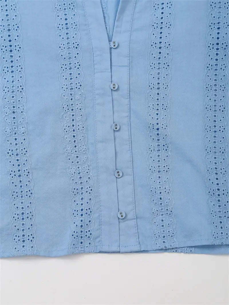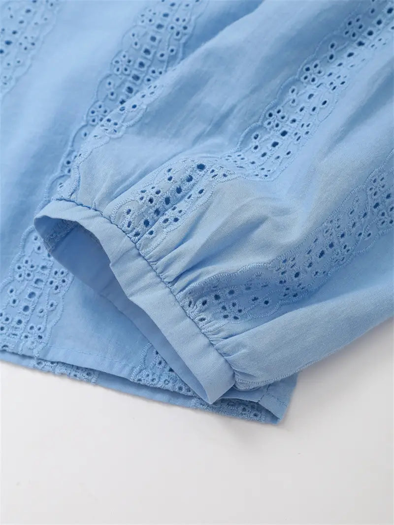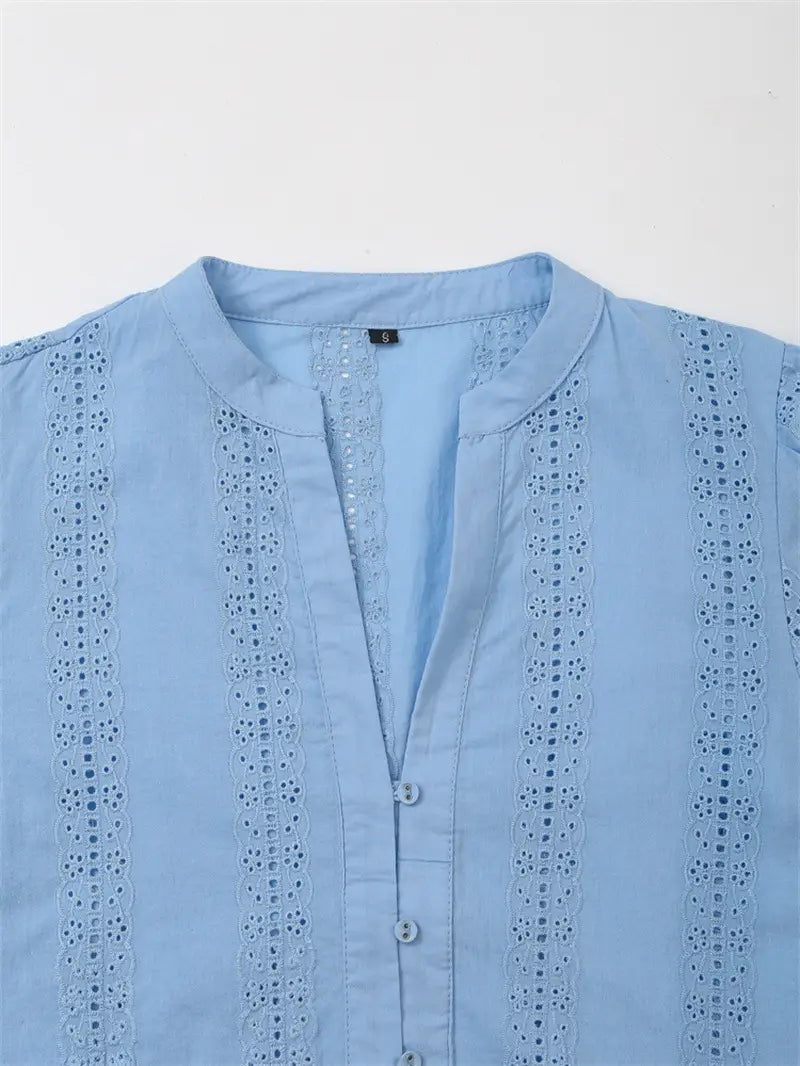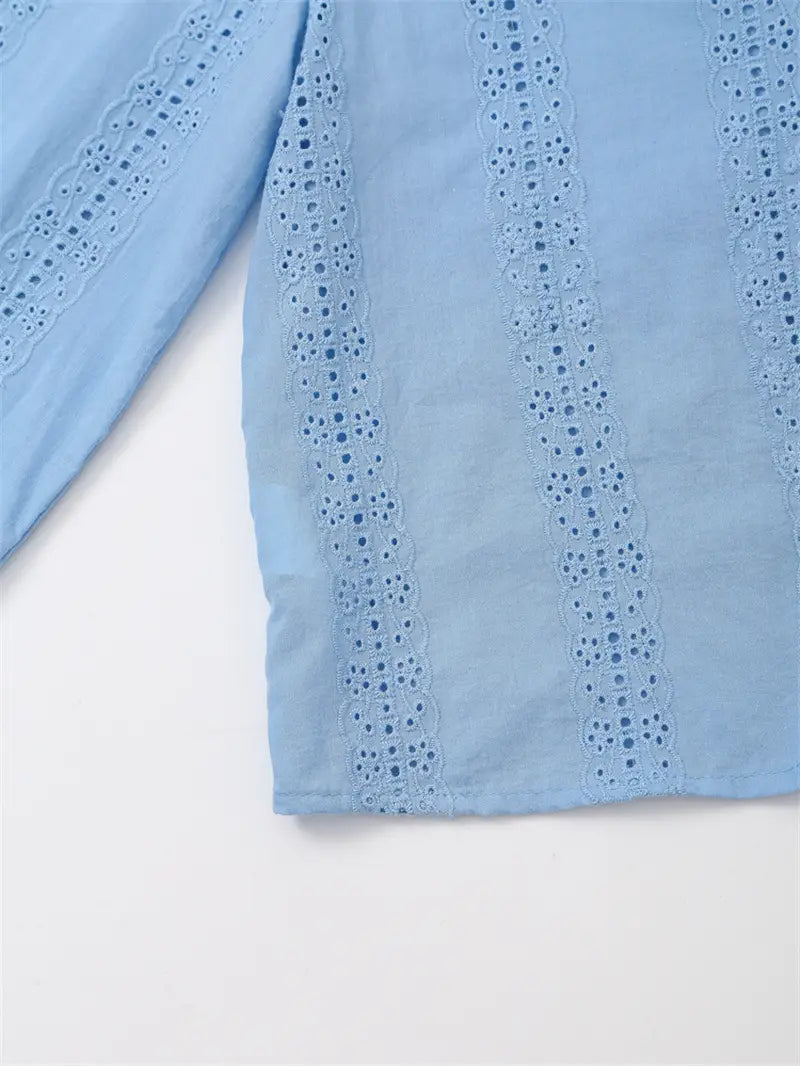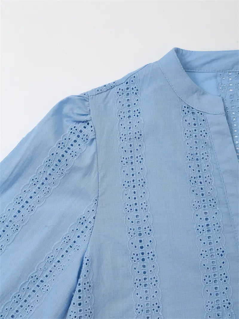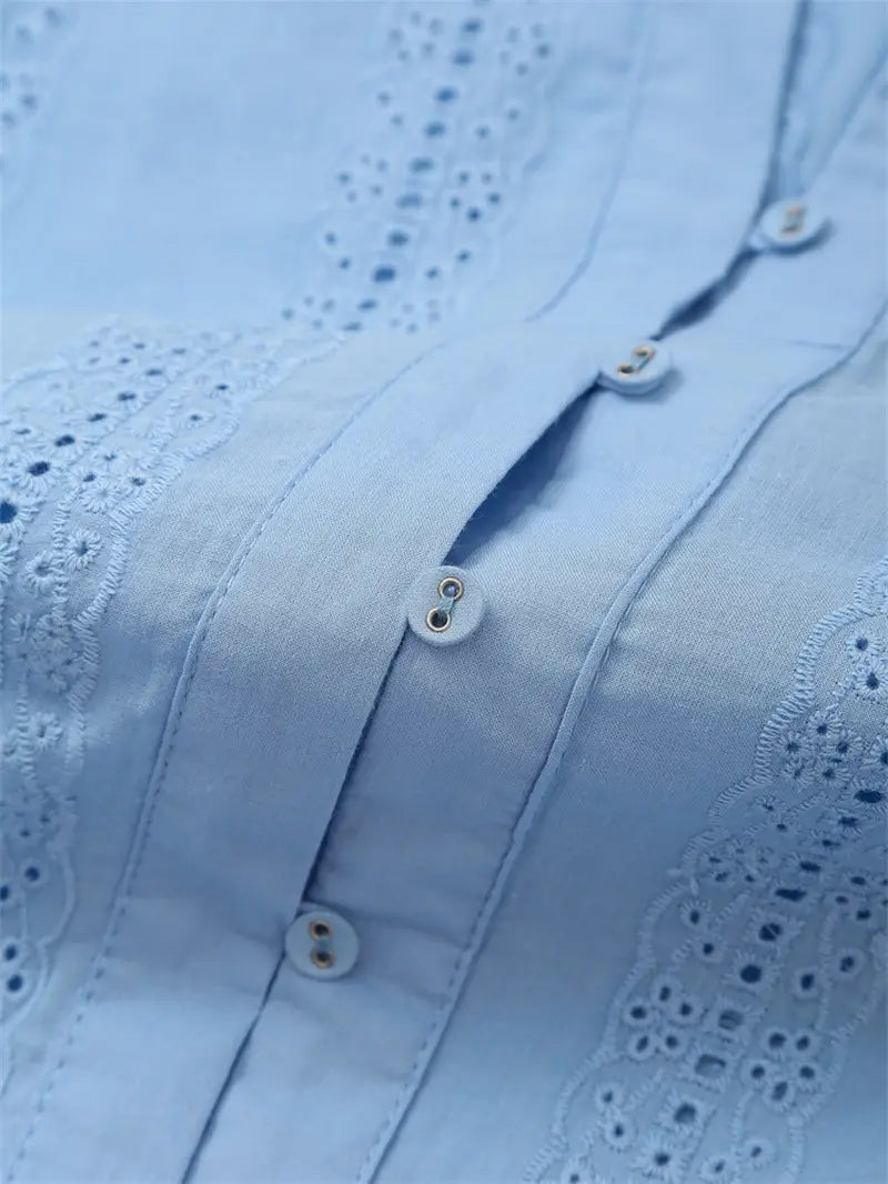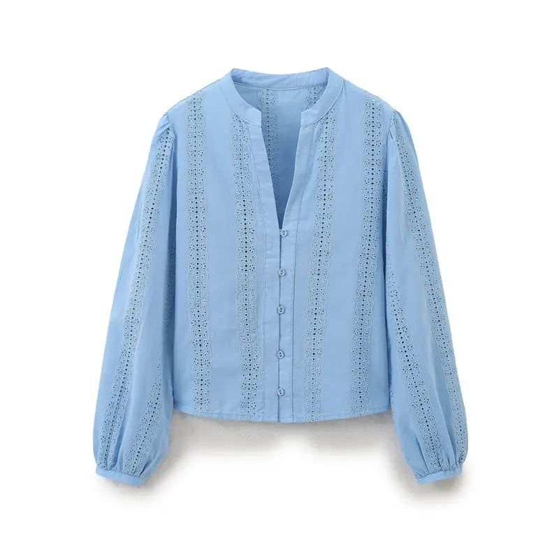 Crew Neck Long Sleeve Single-breasted Blue Embroidered Shirt For Women - Other