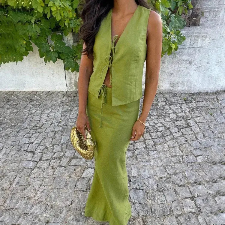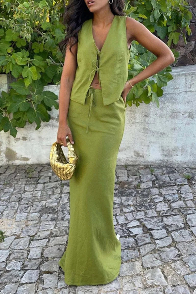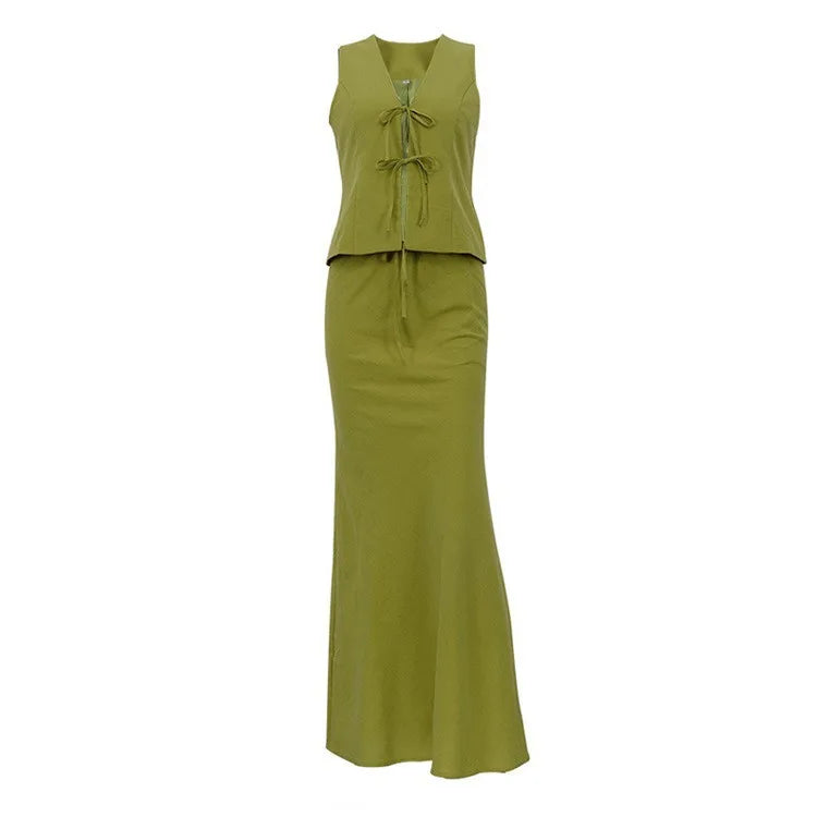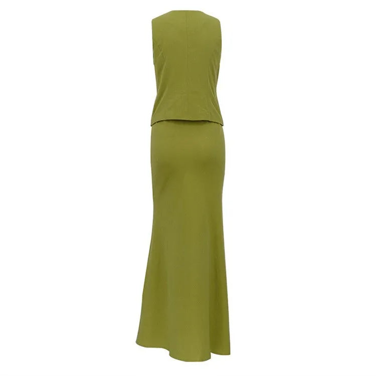 Elegant Vest Skirt Two Piece Set Women - green / XXL