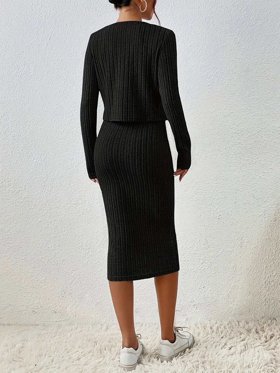 Front Button Cropped Top And Slim Fit Dress - Black / L - electronic accessories