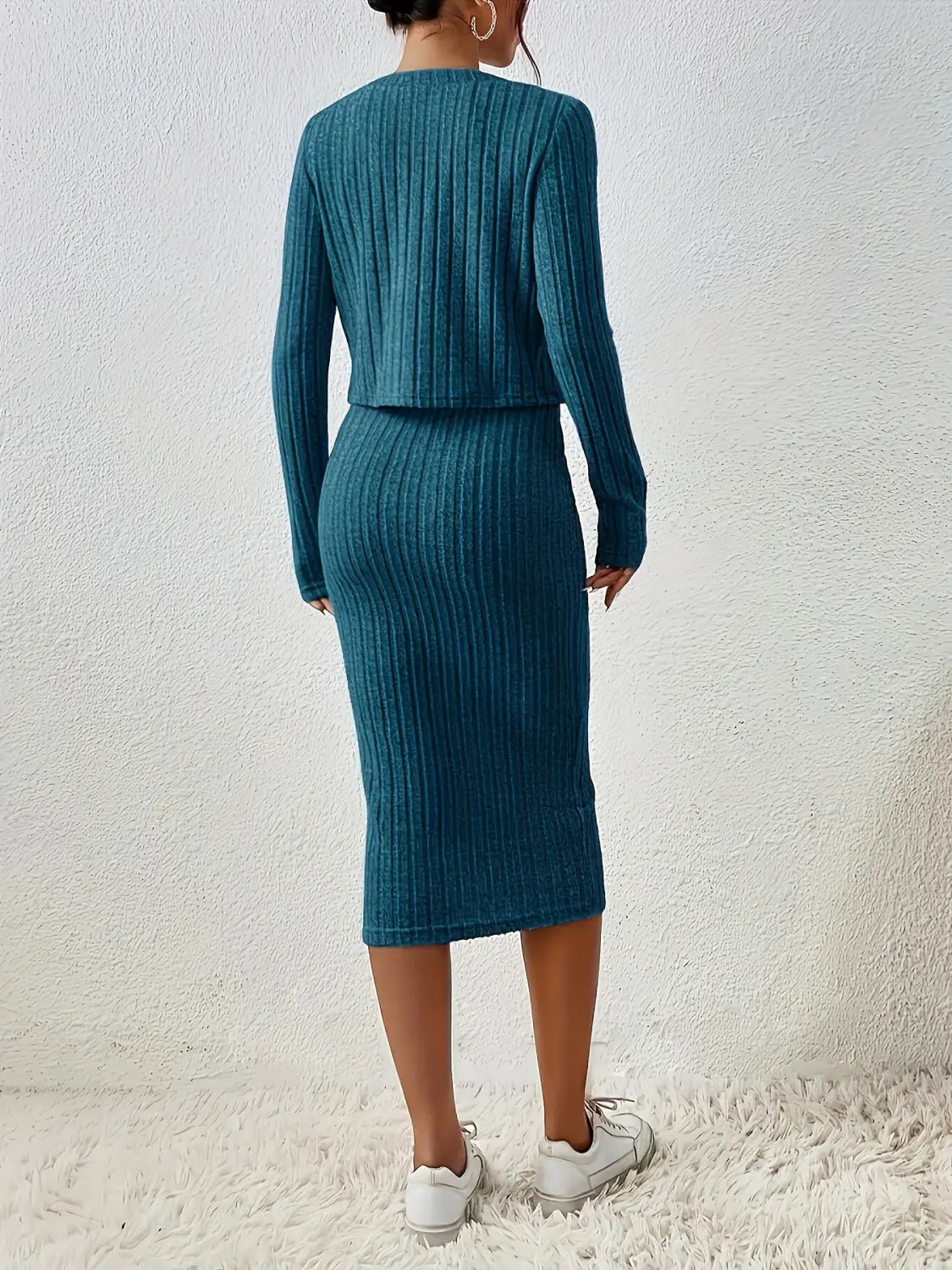 Front Button Cropped Top And Slim Fit Dress - Sea Blue / L - electronic accessories