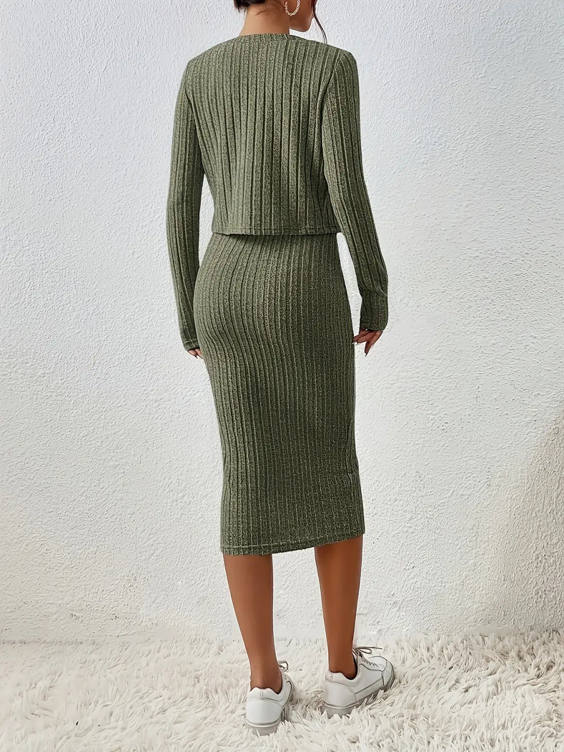 Front Button Cropped Top And Slim Fit Dress - Army Green / L - electronic accessories