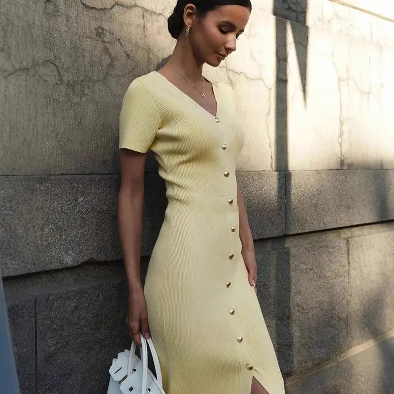 High Waist Knitted Dress For Women - Yellw- no belt / L