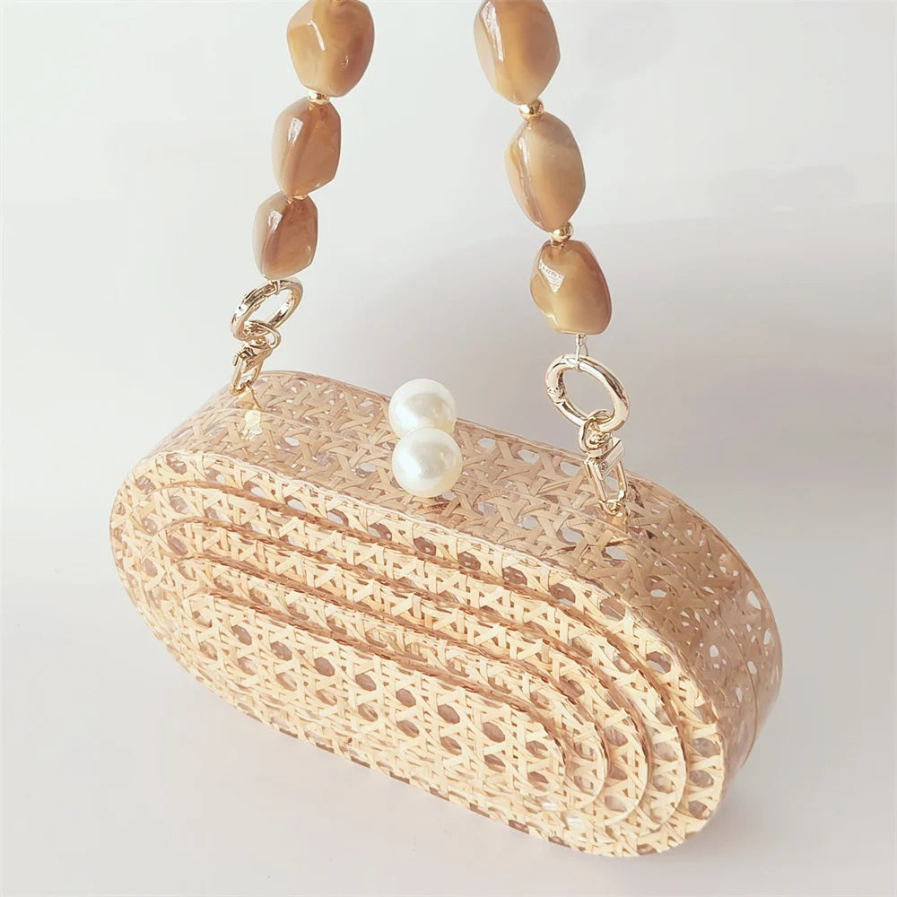Lady Women Rattan Clutch Acrylic Egg Cane Bag - beaded handle