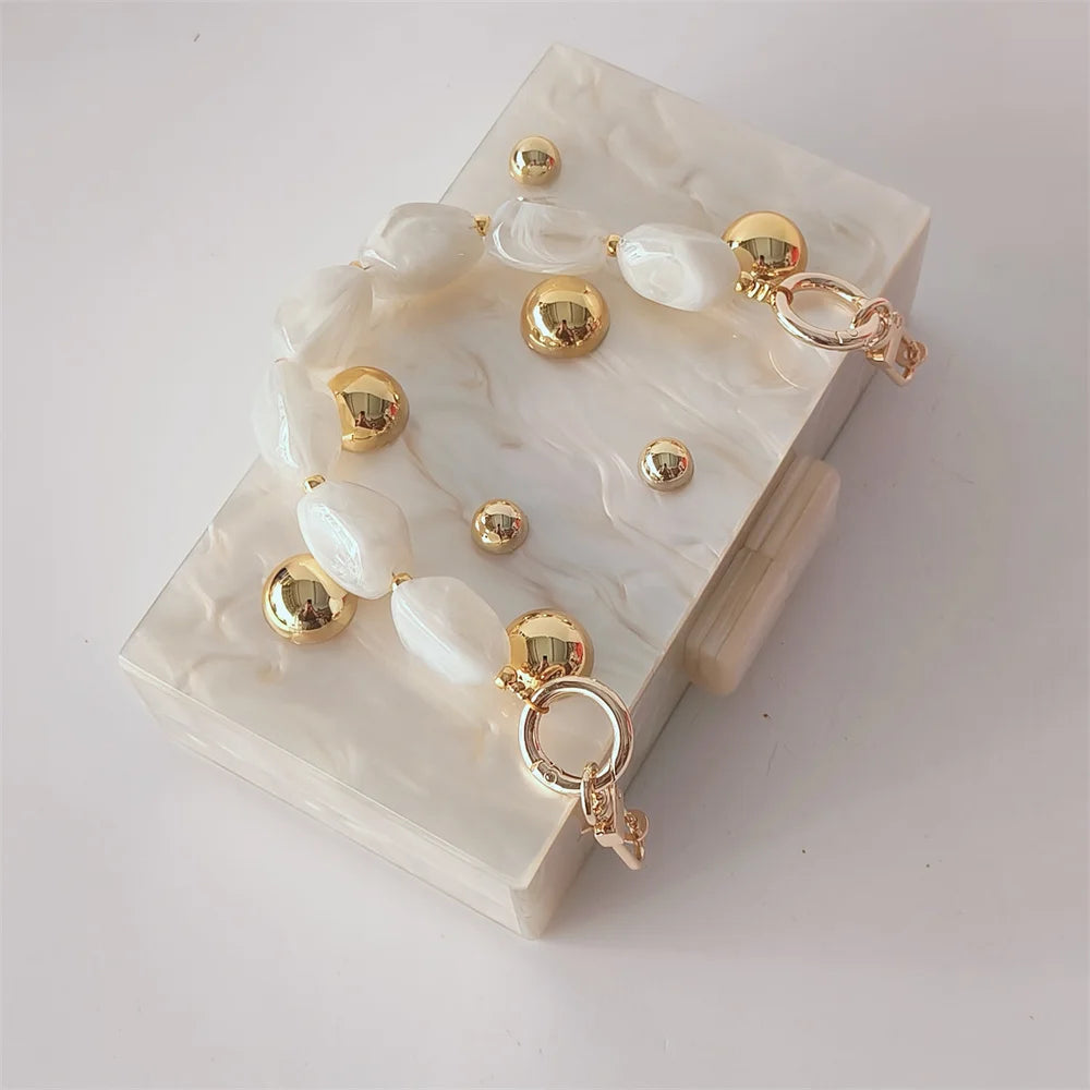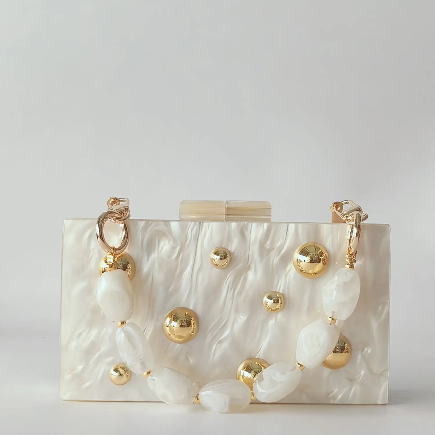 Pearl Beige Metal Dot On Surface Acrylic Clutch Purse - snake chain / Mini(Max Length<20cm)