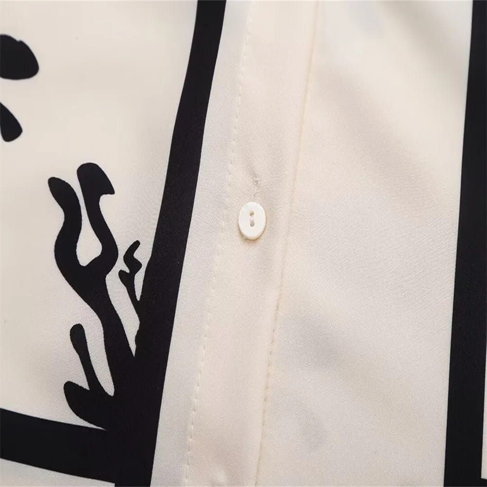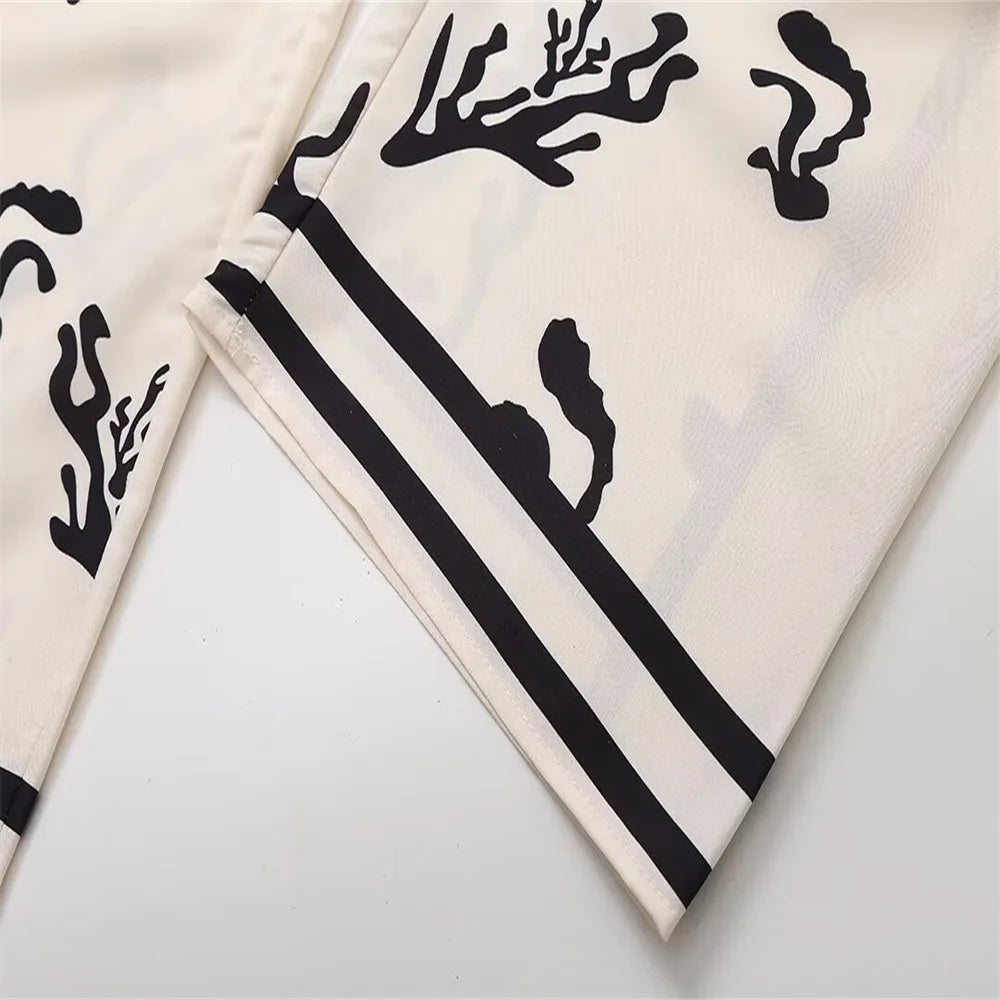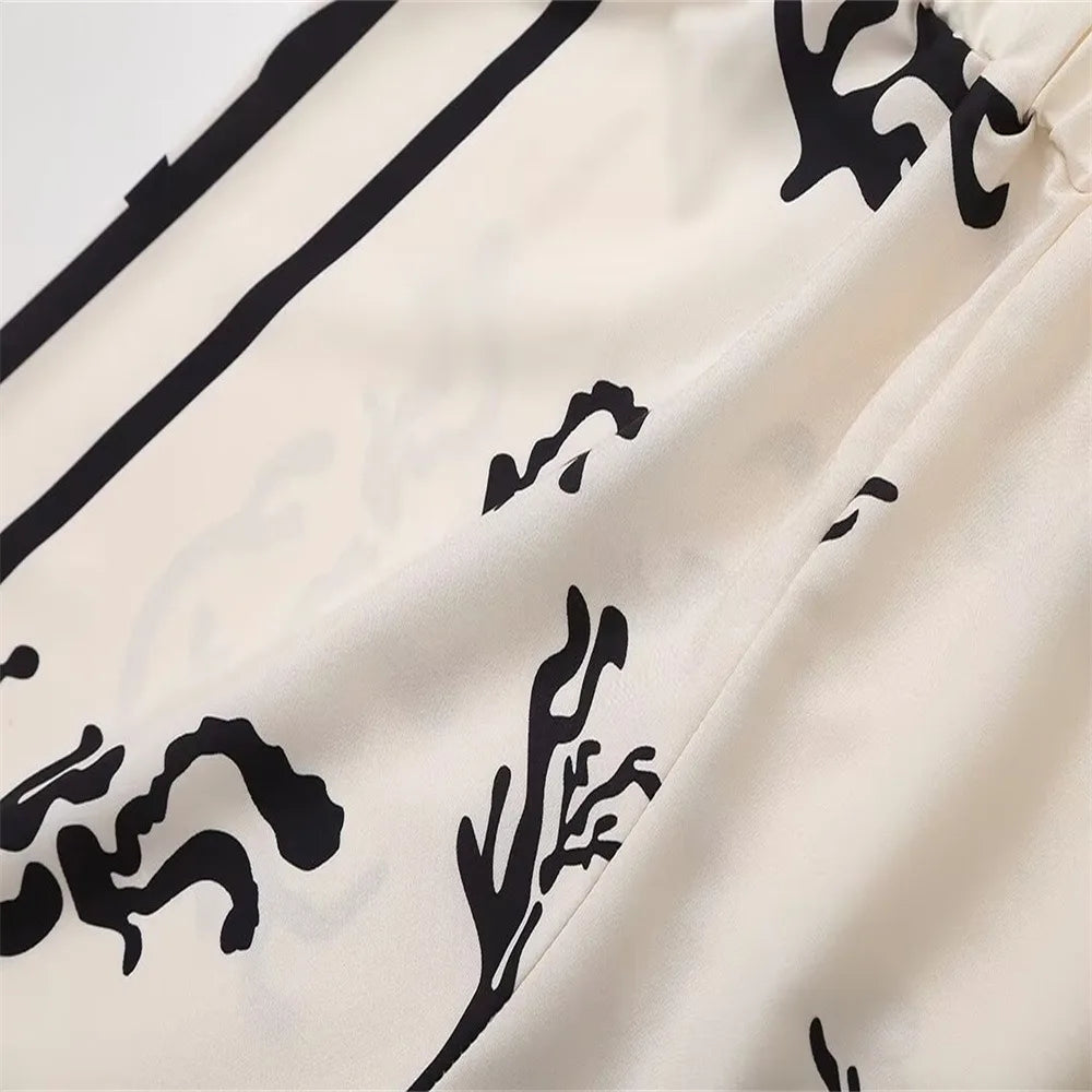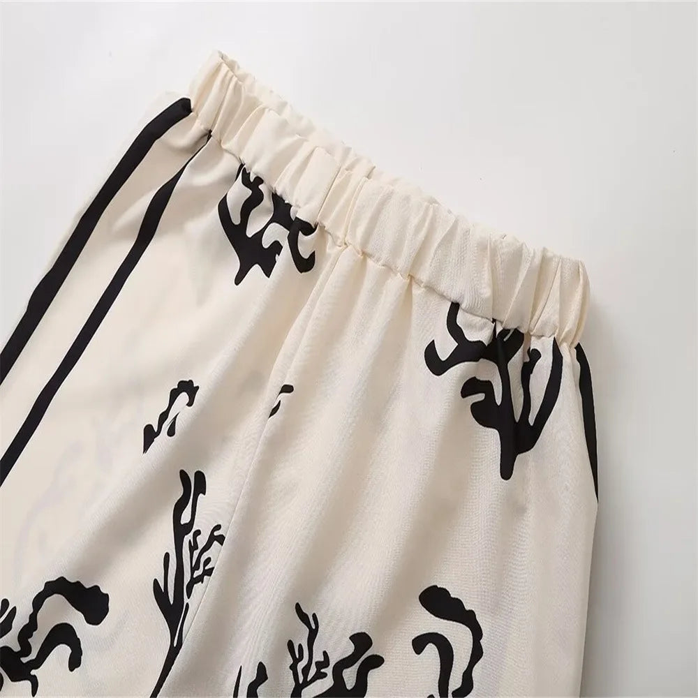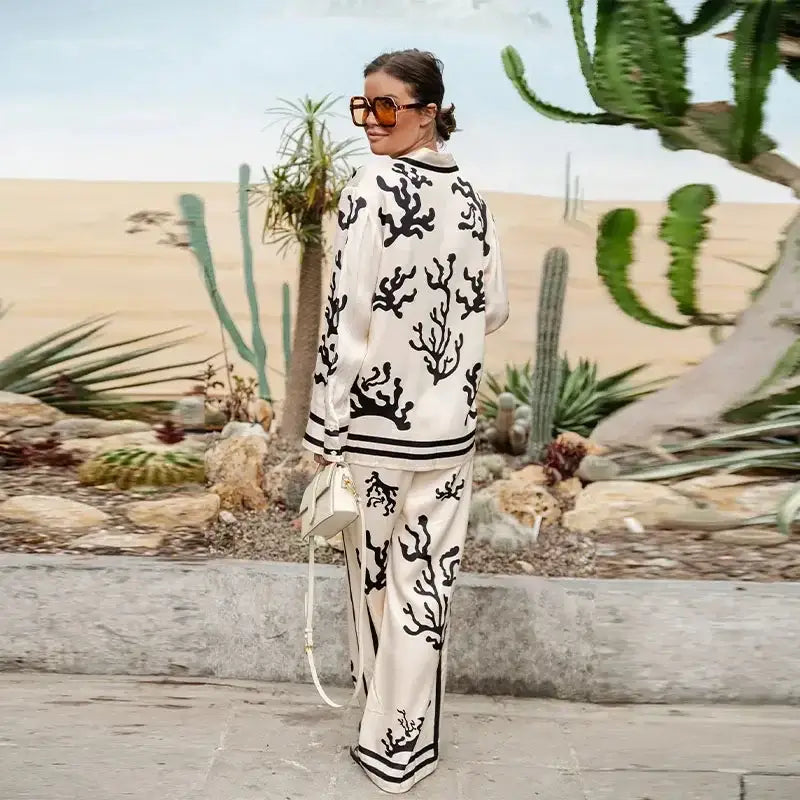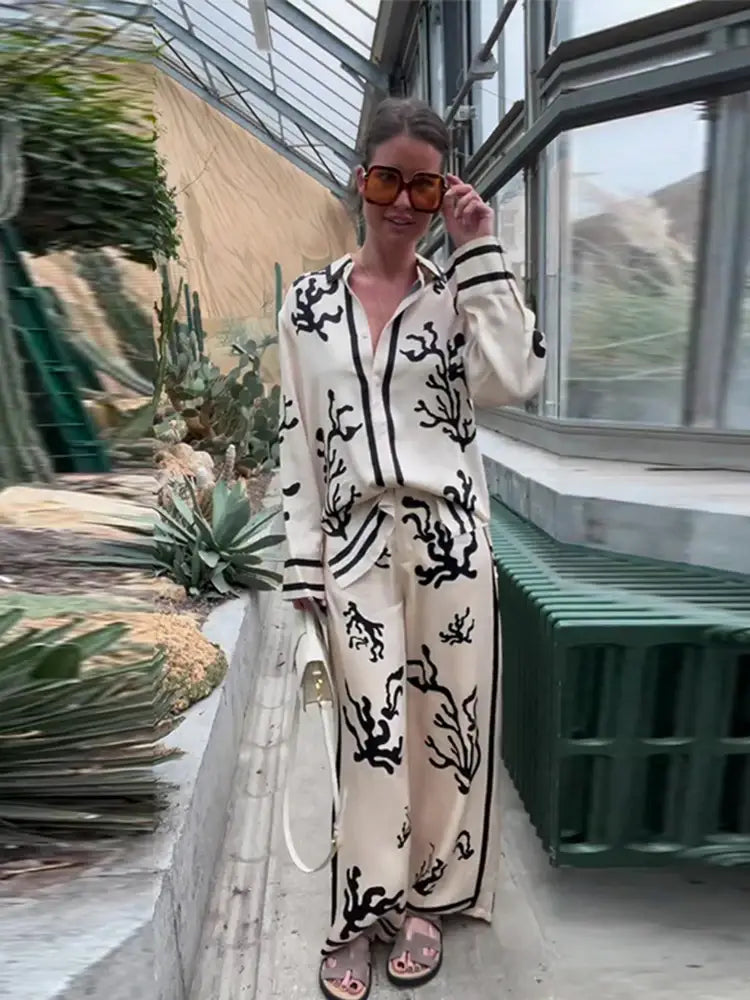 Print Anzug Frauen Casual Revers Langarm Bluse Weite Beinhose