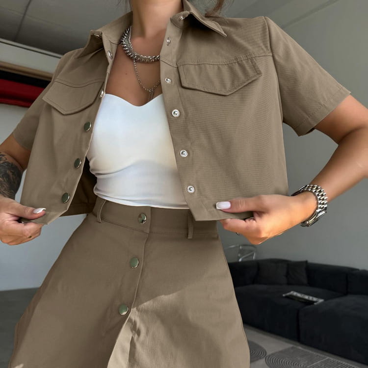 Retro-Revers Kurzarm-Oberteil Doppellagiger hoch taillierter Hosenrock Zweiteiliges Set