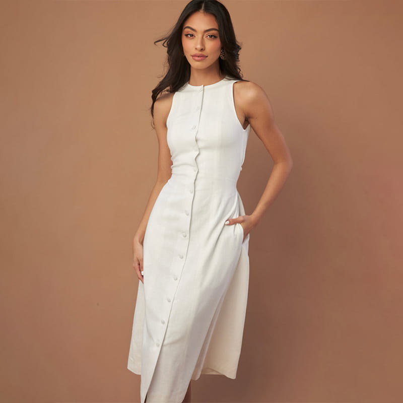 Sleeveless Round Neck Multi-button Strap Casual Dress - Milky White / L - electronic accessories