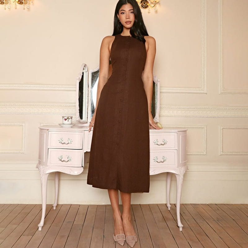 Sleeveless Round Neck Multi-button Strap Casual Dress - Brown / L - electronic accessories