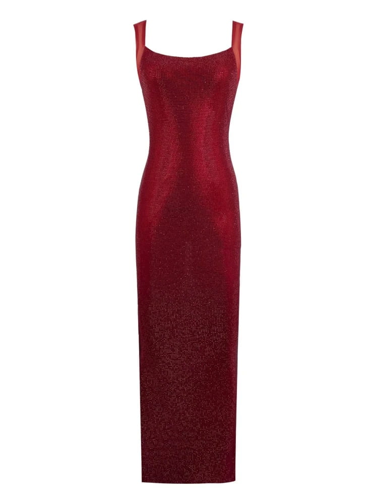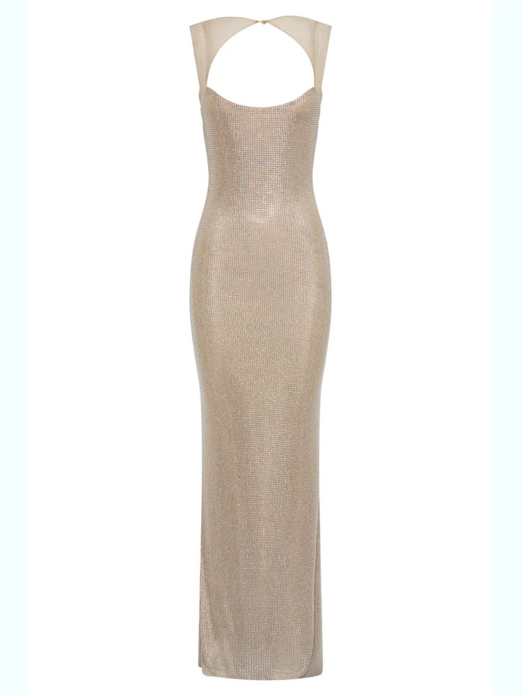 Square Collar Mesh Patchwork Diamonds Long Dress Women