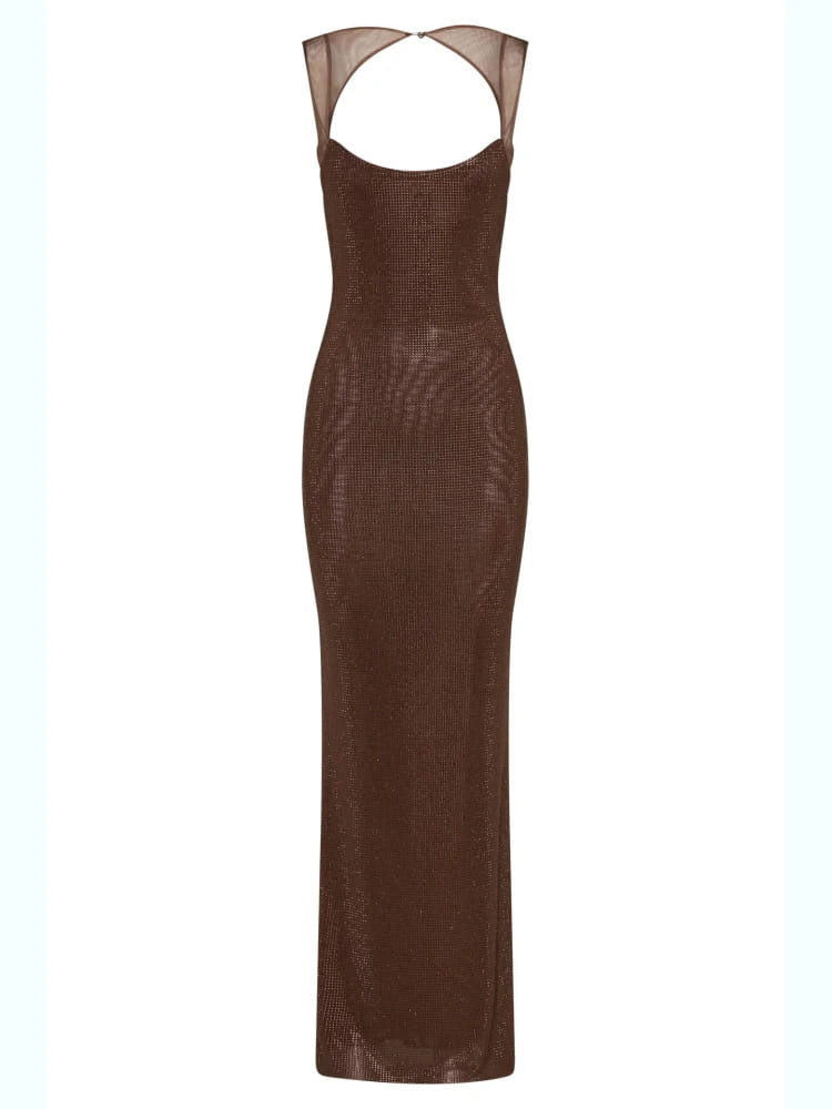Quadratischer Kragen Mesh Patchwork Diamanten Langes Kleid Damen