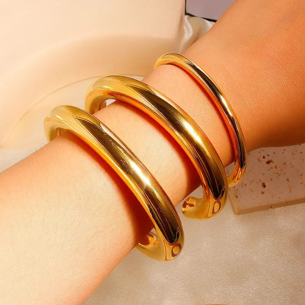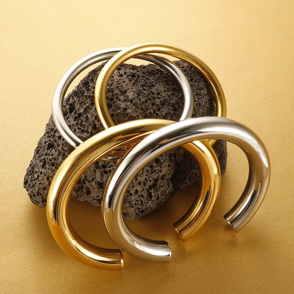 Stainless Steel Gold Color Thick Tube Open Bangle For Women