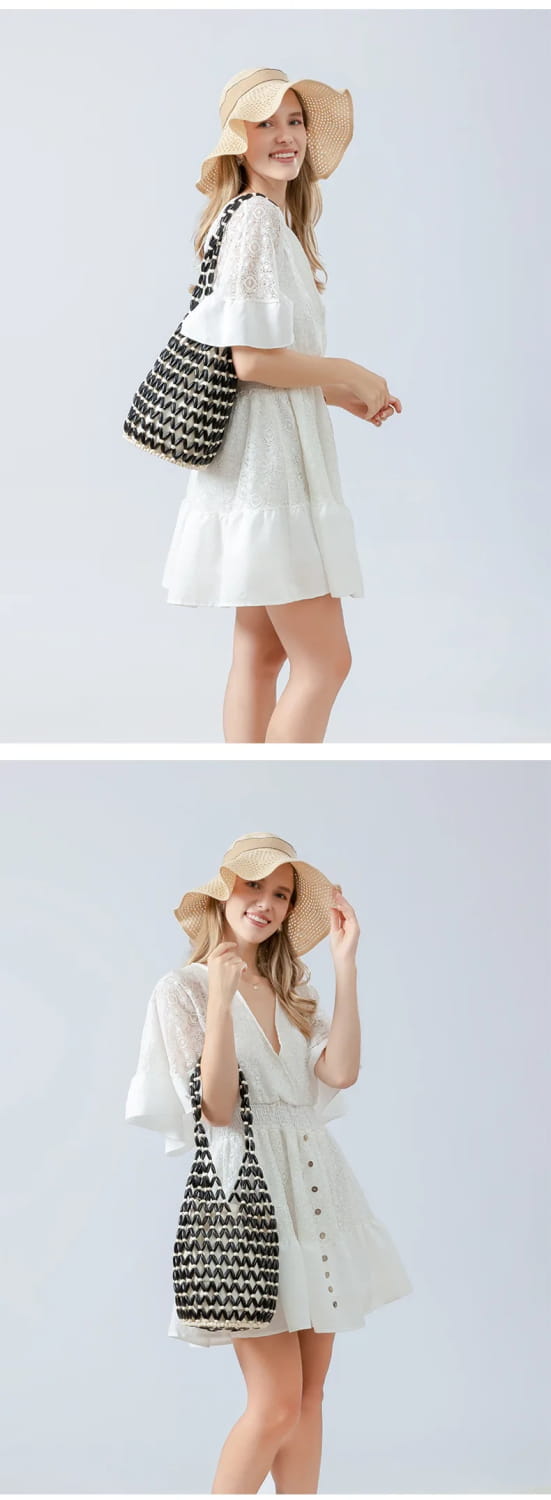Summer Design Hollow-out Wooden Bead Tote Bucket Shoulder Bag - white black / 16.5x36cm
