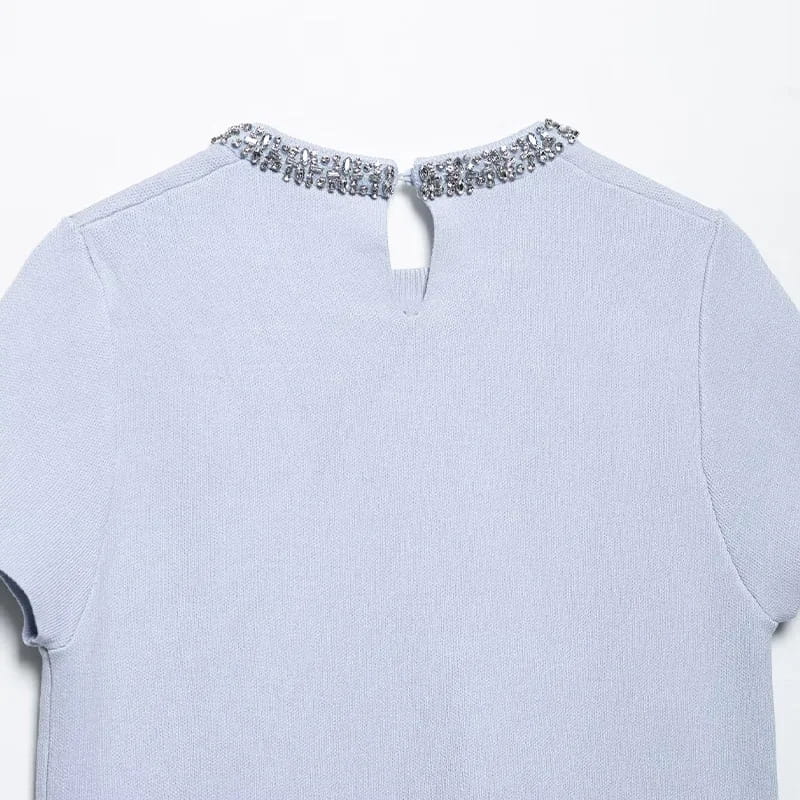 Women Fashion With Pearls Blue Knitted Pullover Sweater Vintage O-Neck Short Sleeves