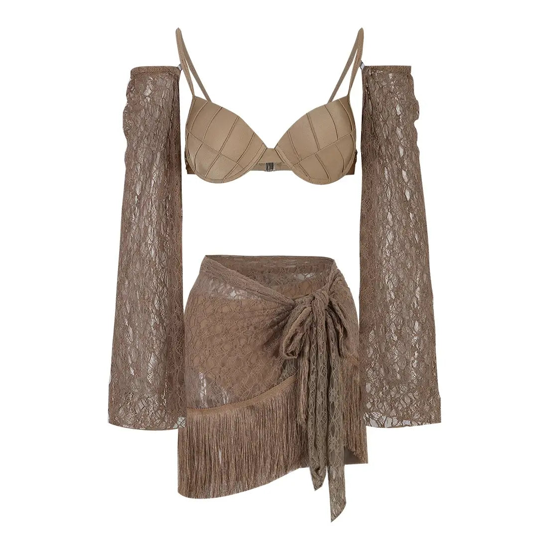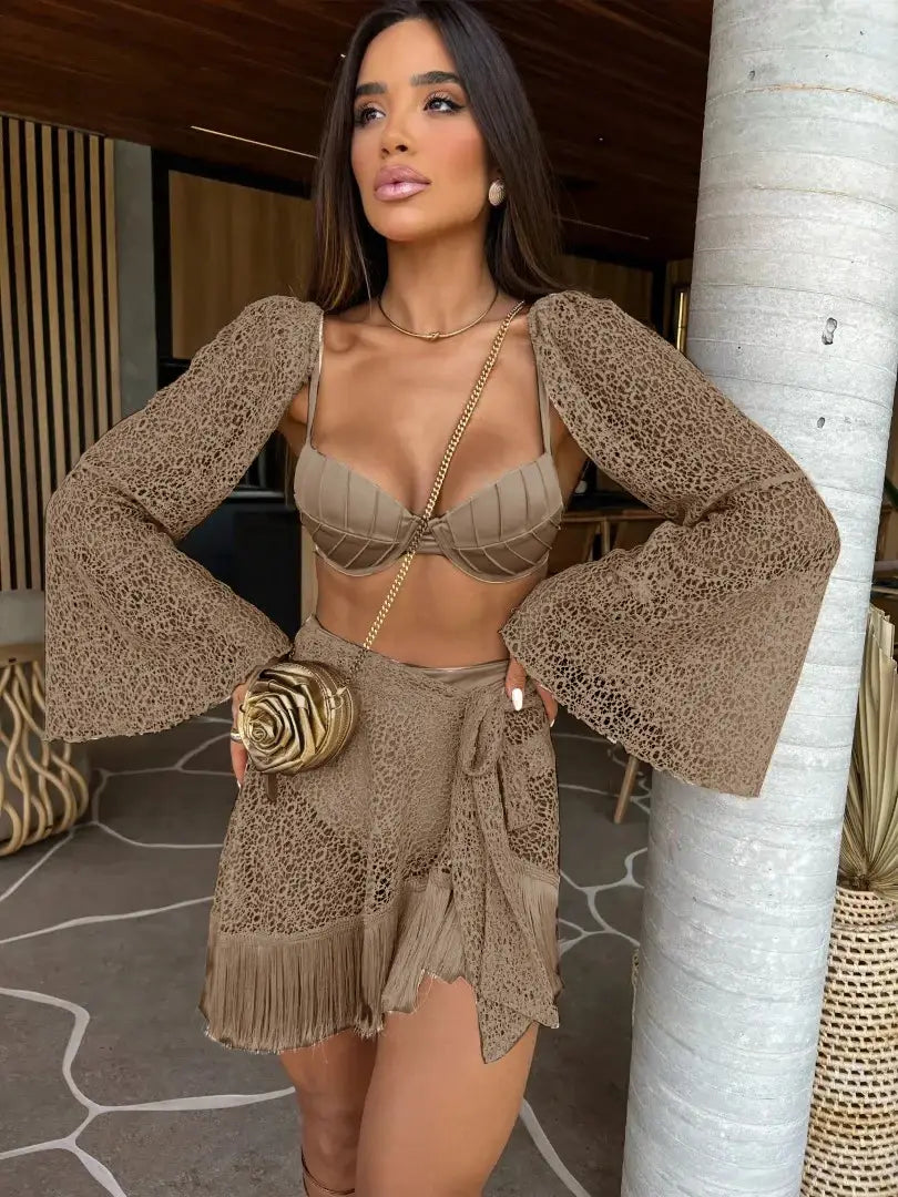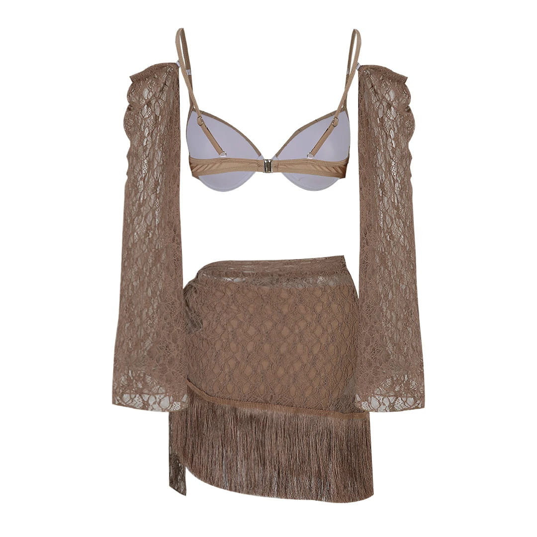 Women Long Sleeve Mini Skirt Suit 3 Piece Set Bathing