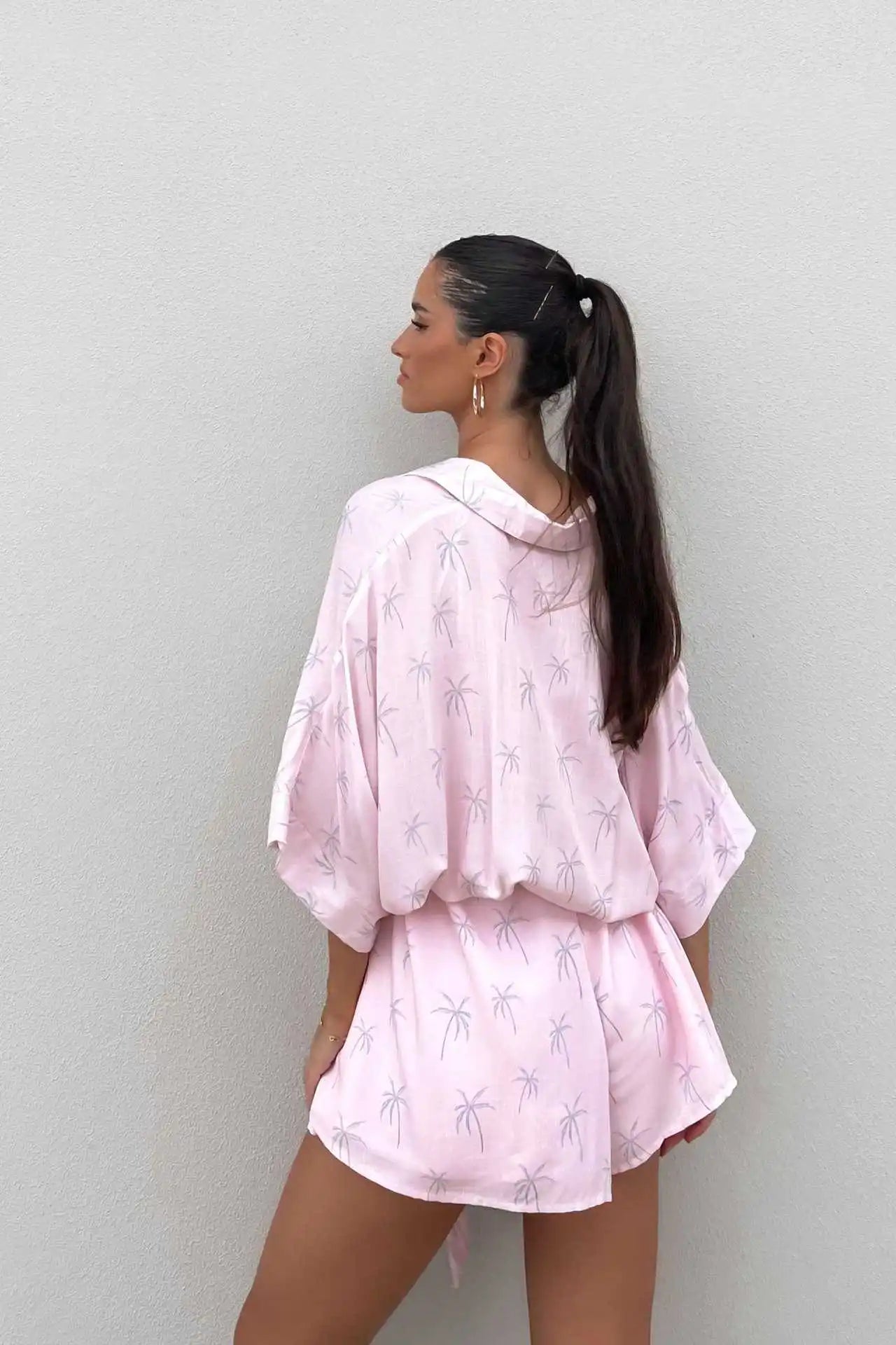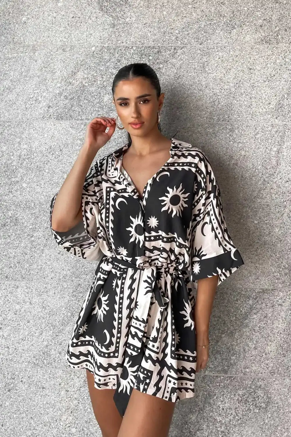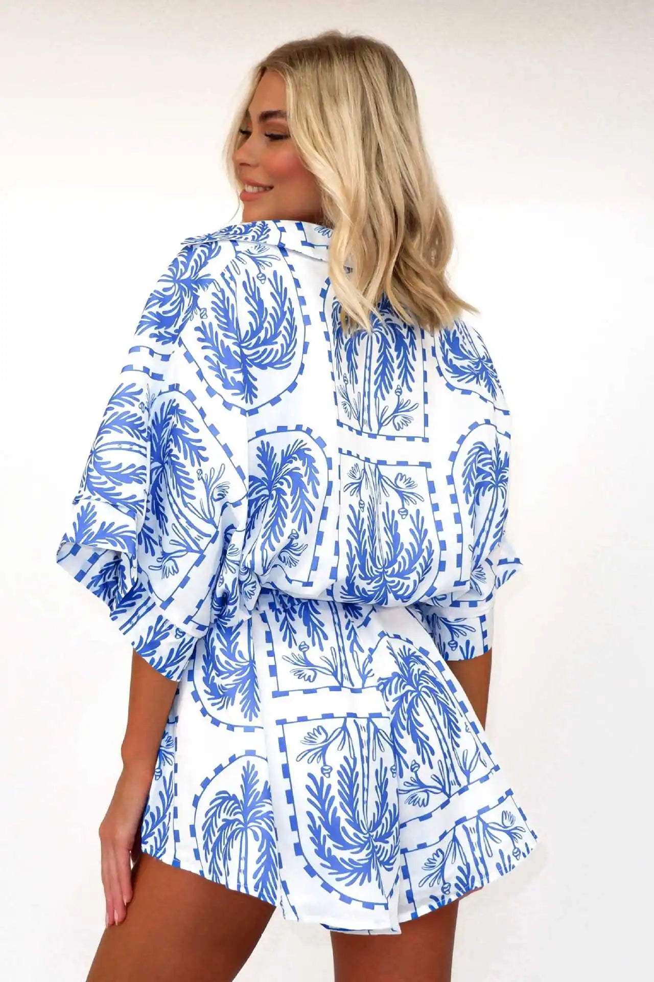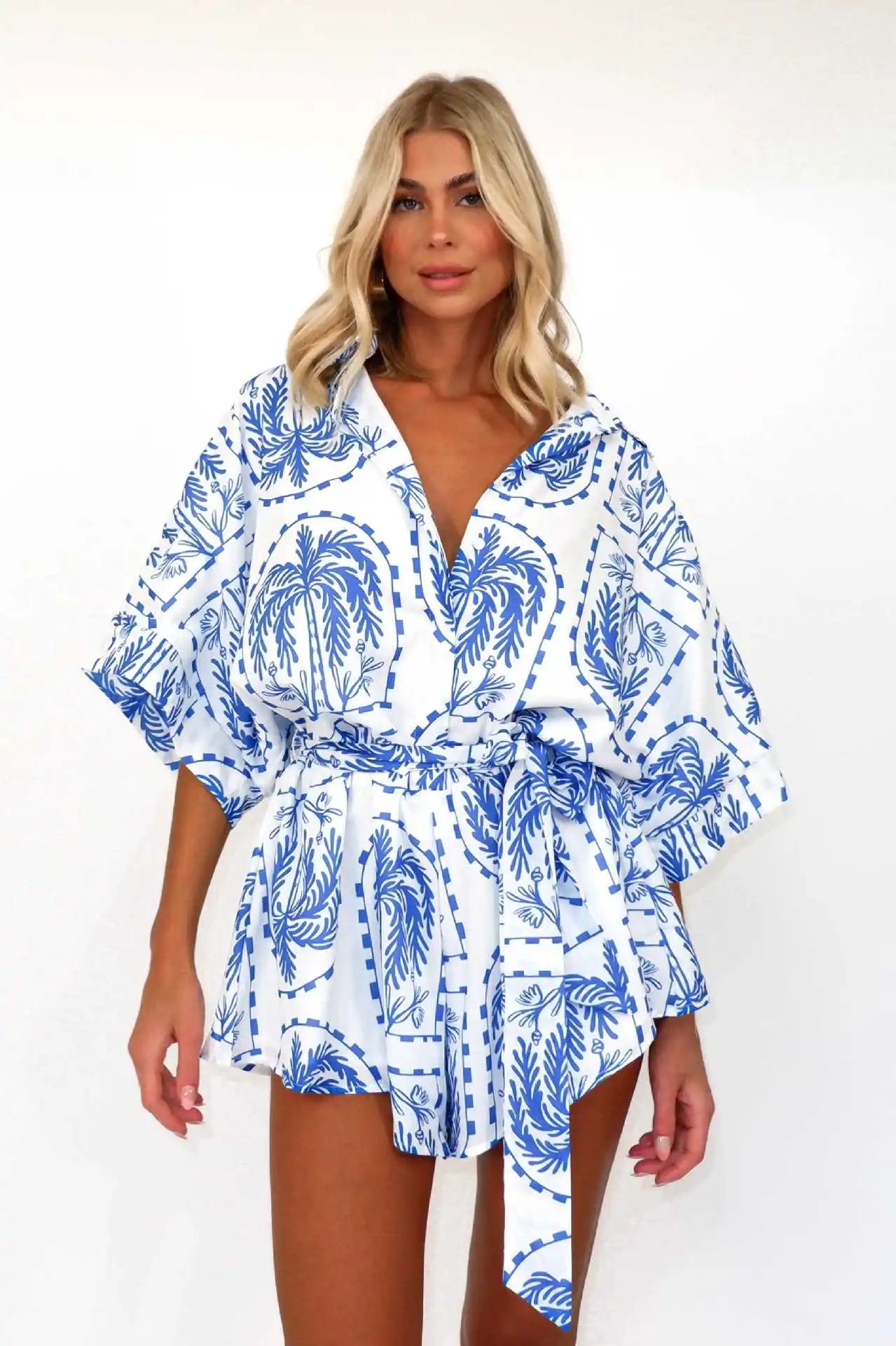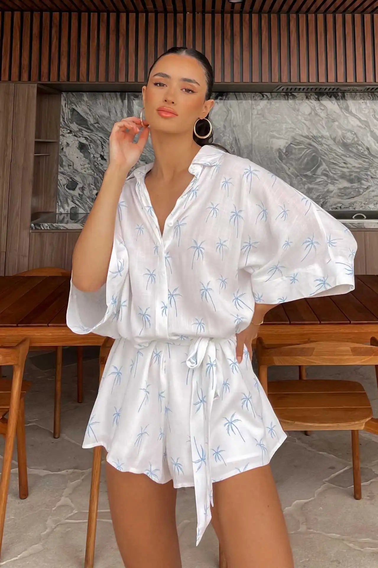 Women’s Loose Printed Pullover Half-sleeved Tie High Short Rompers Jumpsuits - 11 / S