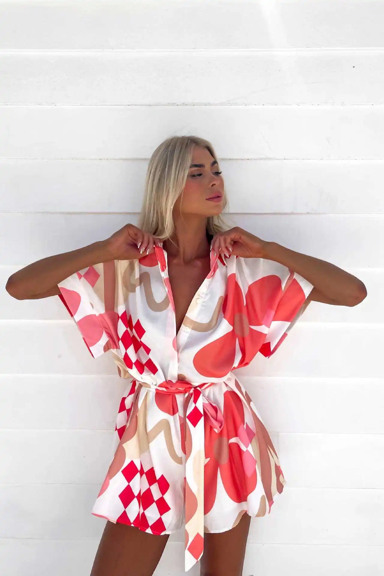 Women’s Loose Printed Pullover Half-sleeved Tie High Short Rompers Jumpsuits - 8 / M
