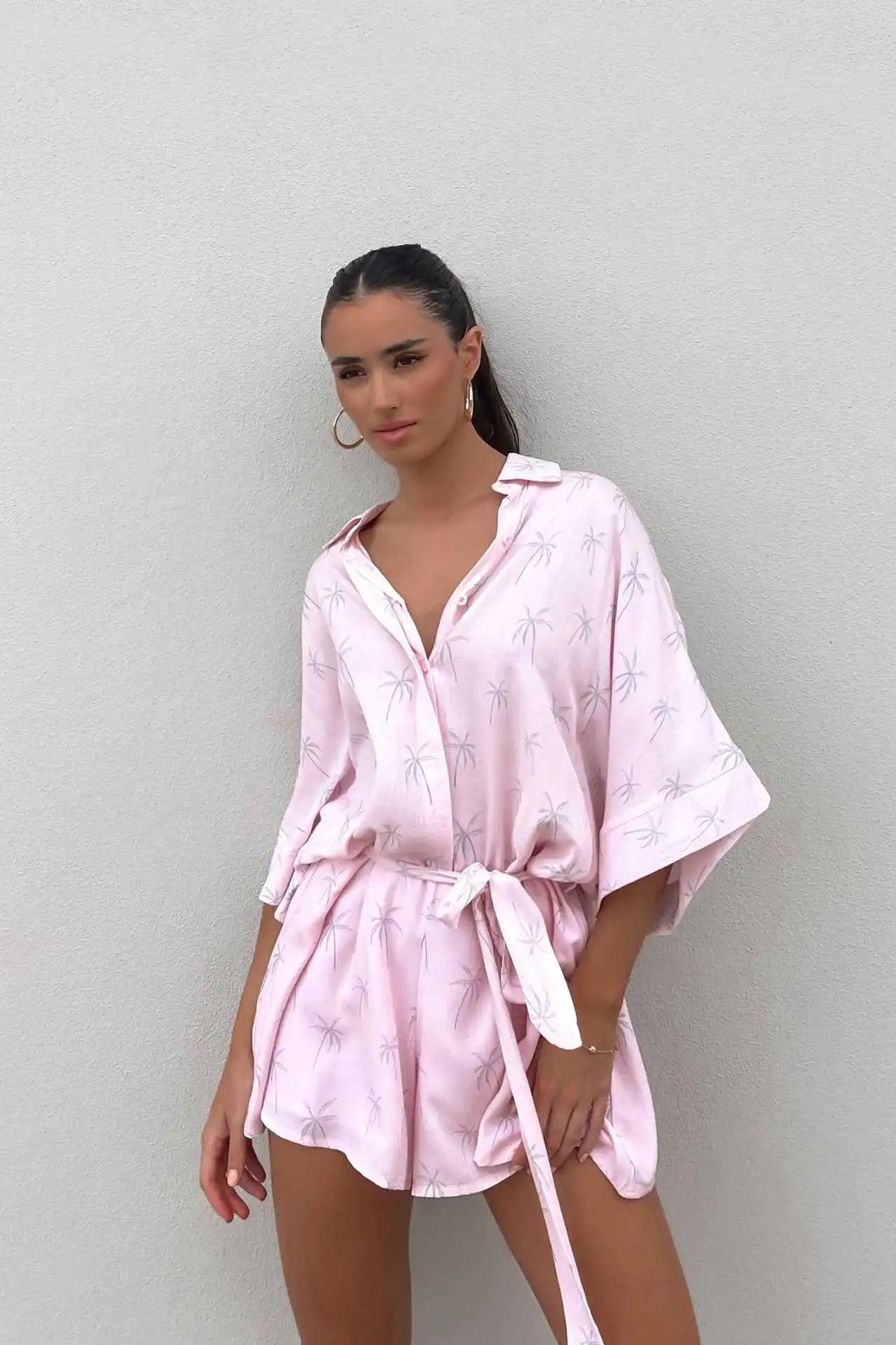 Women’s Loose Printed Pullover Half-sleeved Tie High Short Rompers Jumpsuits - 3 / S