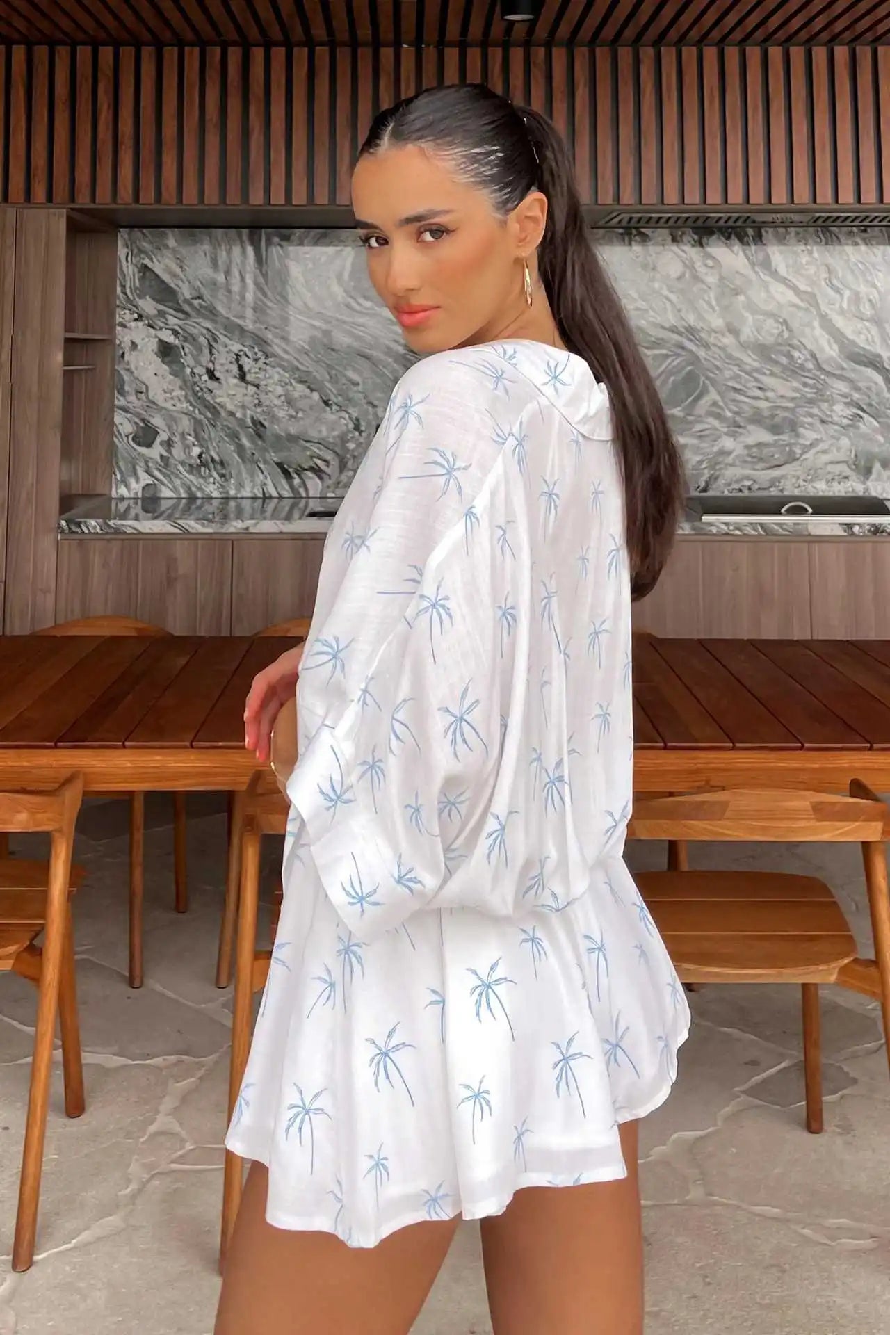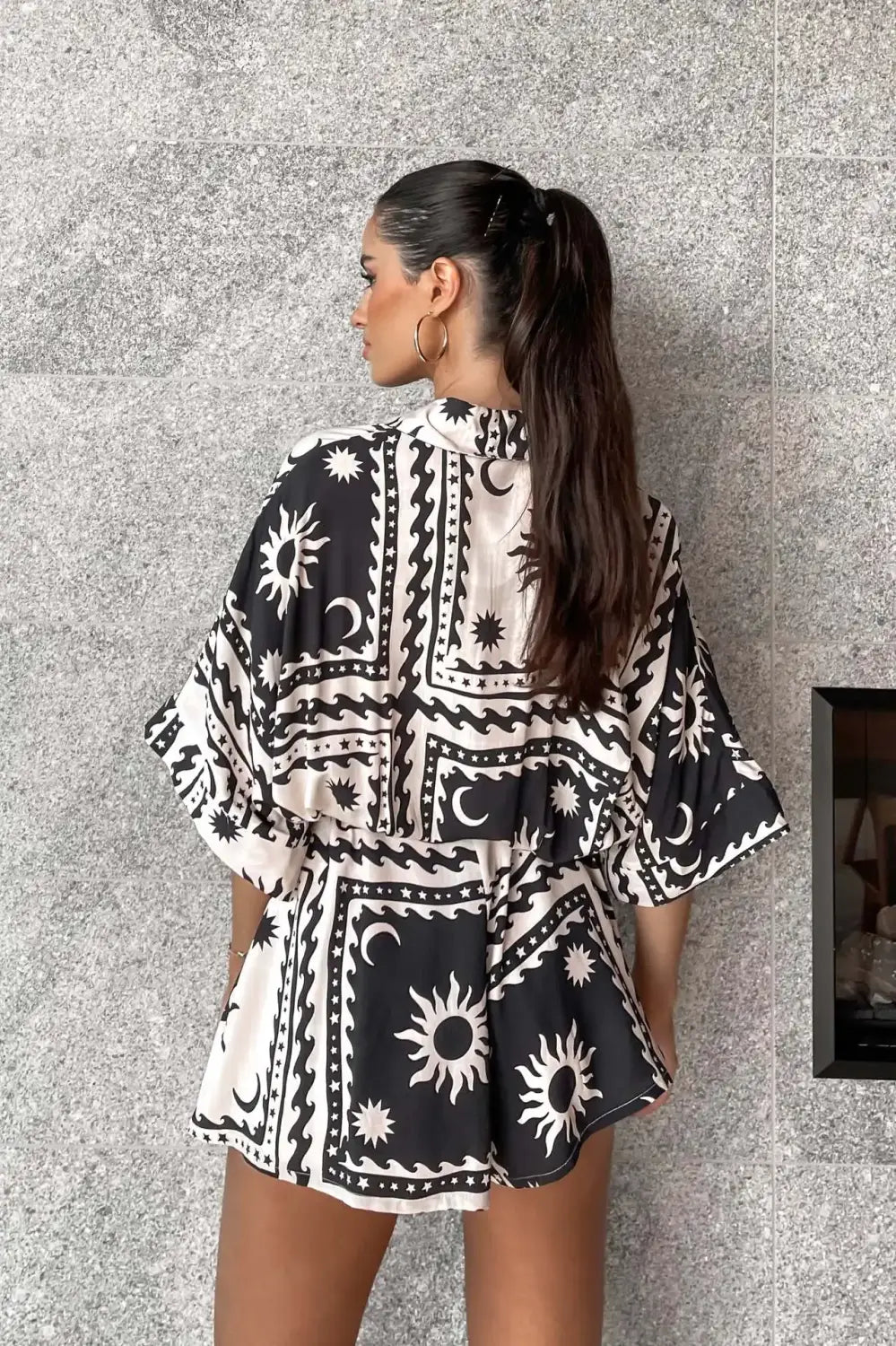 Damen Lose Bedruckte Pullover Halbarm Krawatte Hohe Kurze Strampler Overalls