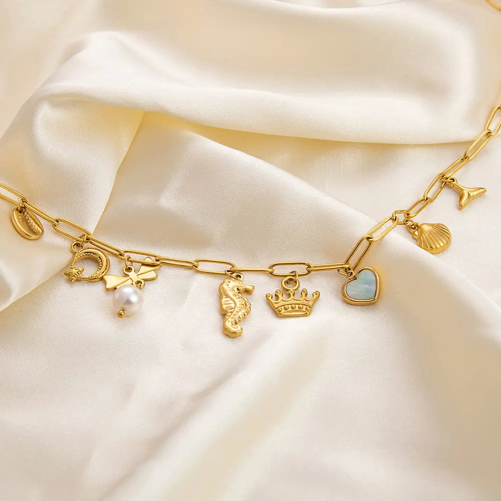 Damen-Halskette aus lichtechtem Edelstahl mit galvanisierter Muschelperle und 18 Karat Gold