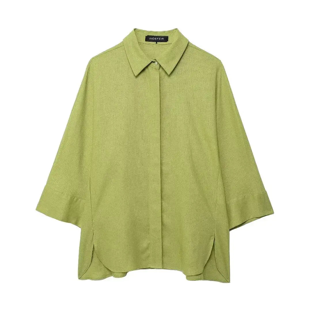 Women’s Two Piece Set Loose Single-Breasted Shirt Elastic Waist Pocket Folds Decorate Wide Leg Pants - Green / XXL