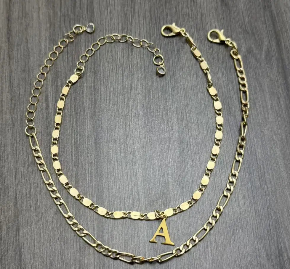Ankelkjede med 26 initialer og dobbel kjede, gullfarget ankelkjede med dobbel kjede