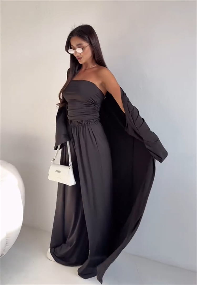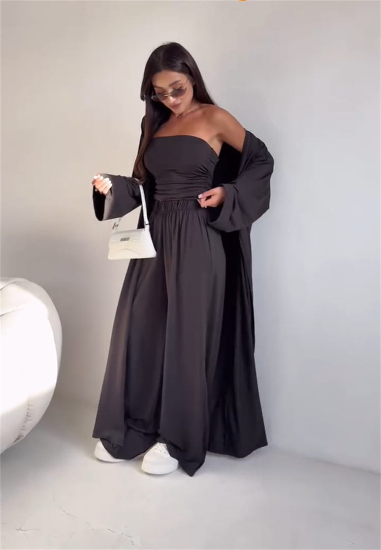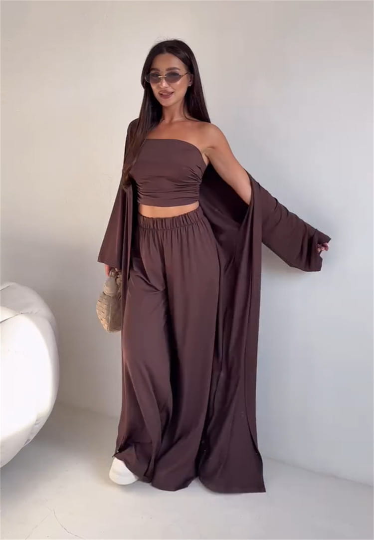 Casual Mid-calf Top Vest Long Cardigan Wide-leg Pants Three-piece Set - Other