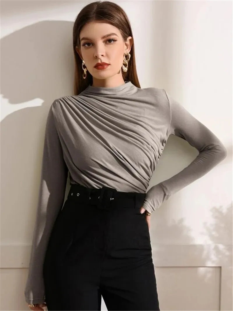 Fall Solid Long Sleeve Women T-shirt - GRAY / S
