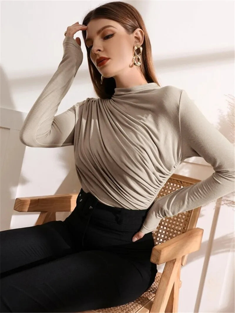 Fall Solid Long Sleeve Women T-shirt - Beige / S