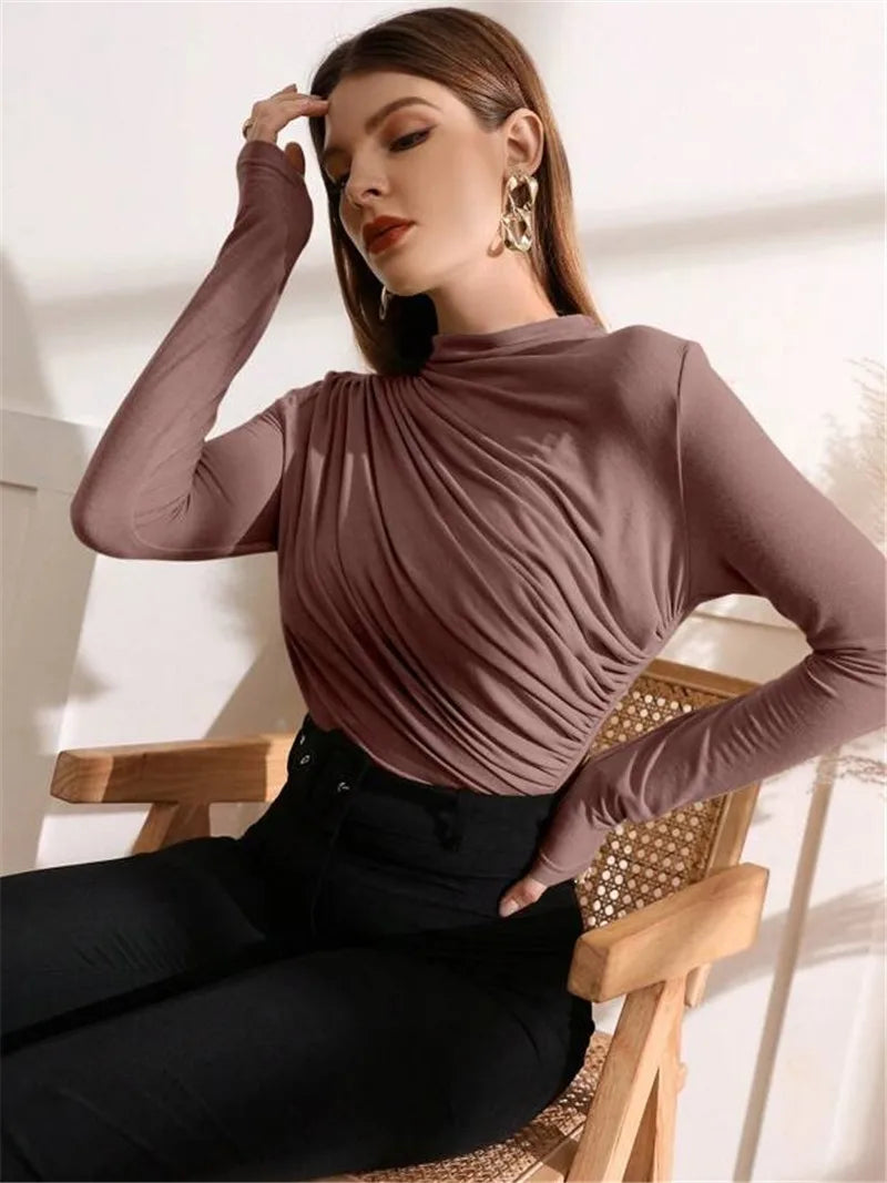 Fall Solid Long Sleeve Women T-shirt - Brown / XL