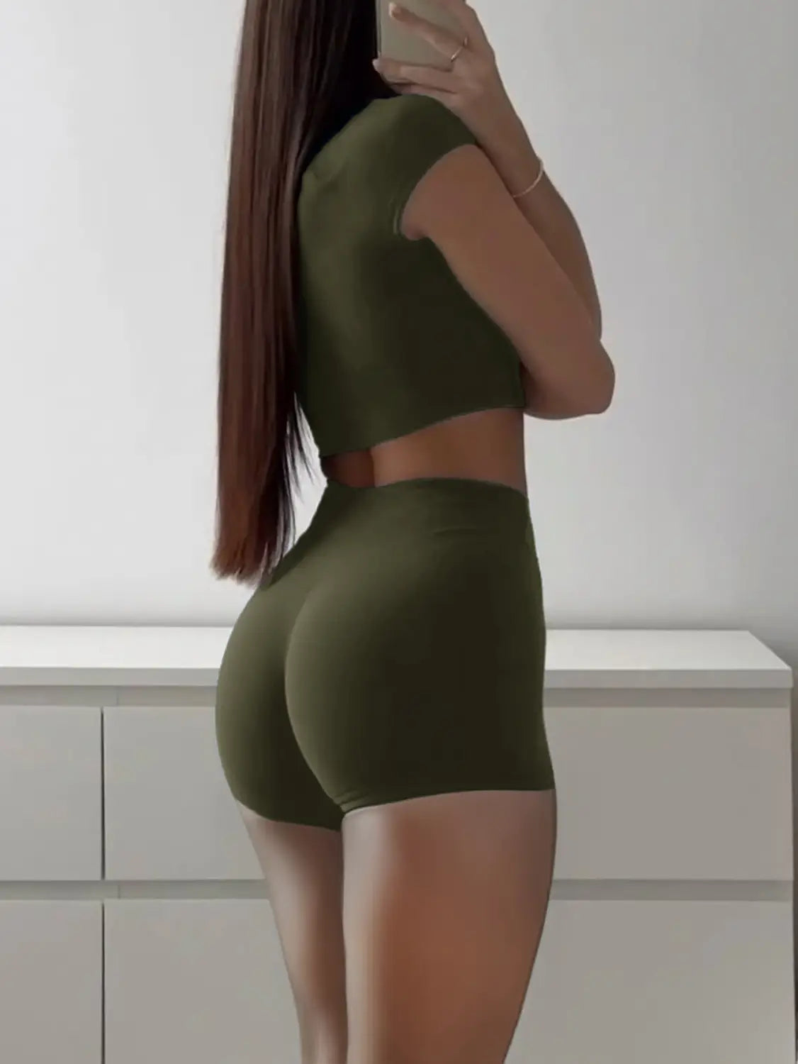 Sports Zipper Short-sleeved Shorts Two-piece Suit - Army Green / L - Other
