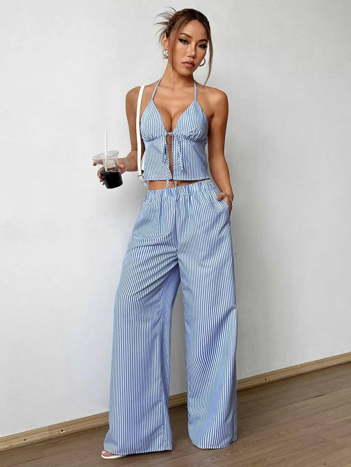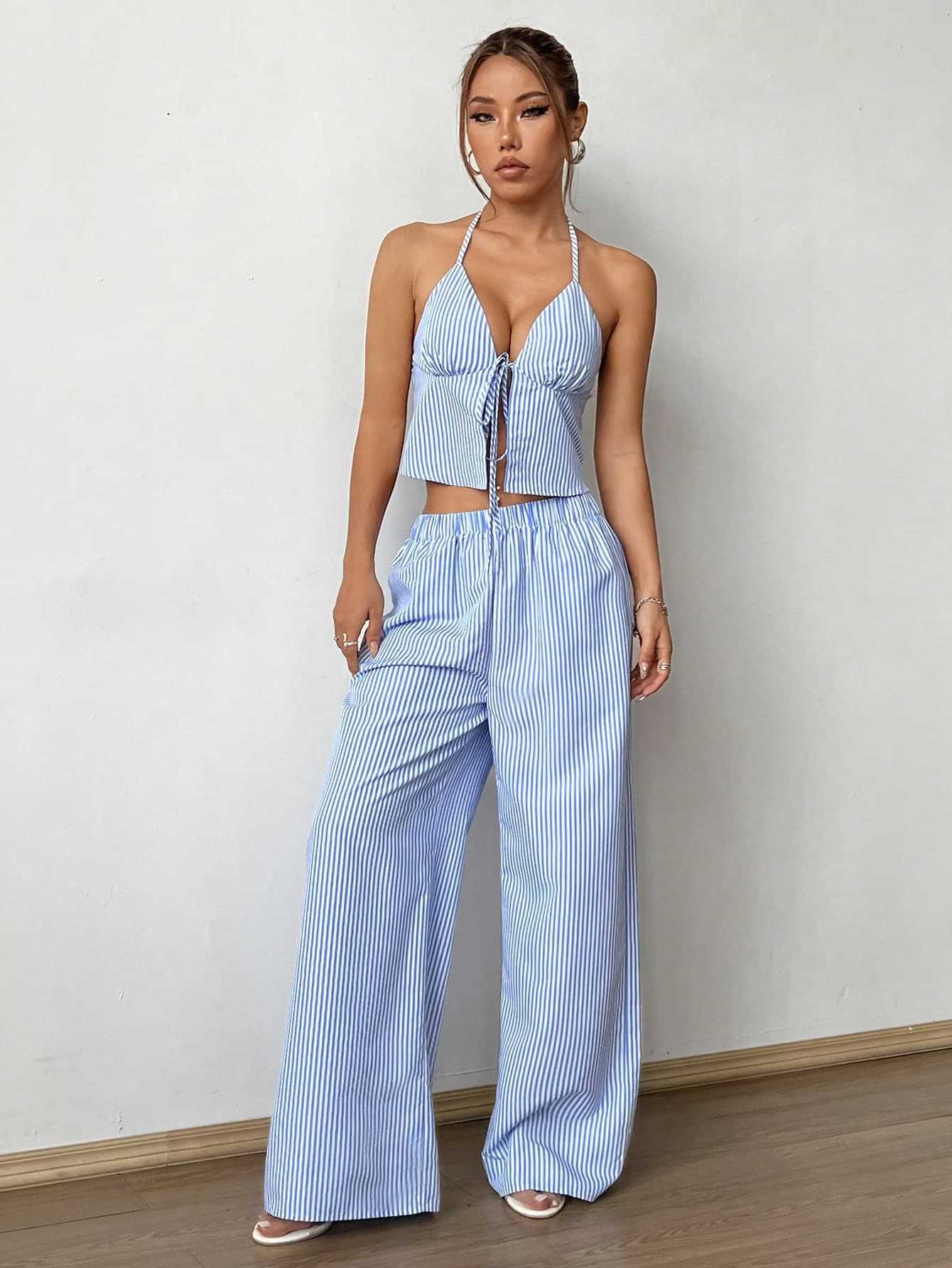 Summer Stripes Vest Plus Stretchy Straight-leg Pants Casual Two-piece Suit - Light Blue Stripe / L - Other