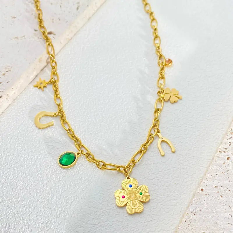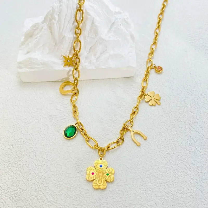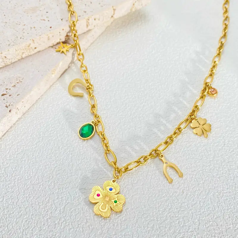 Titanium Steel Necklace Female Ginkgo Leaf Letters Emerald Zircon - N1065 Gold - electronic accessories