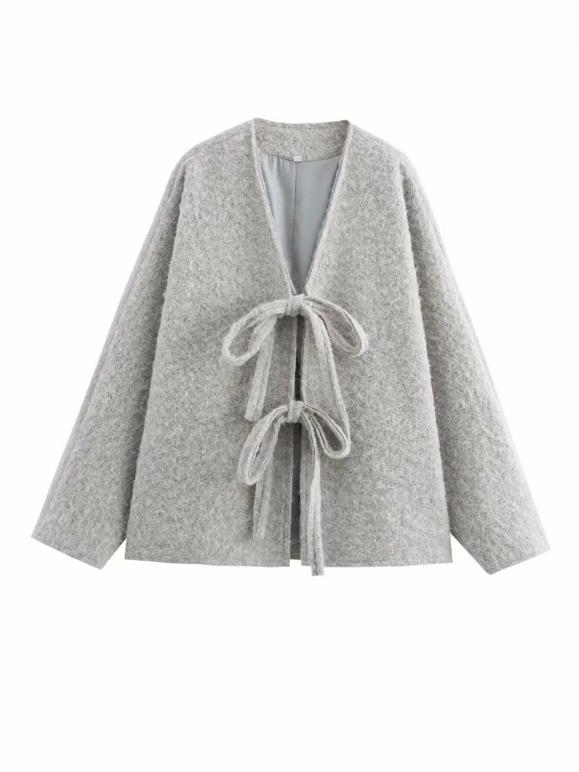 V-neck Cardigan Fashion Casual Lace Up Woolen Coat Short - Gray / L - electronic accessories