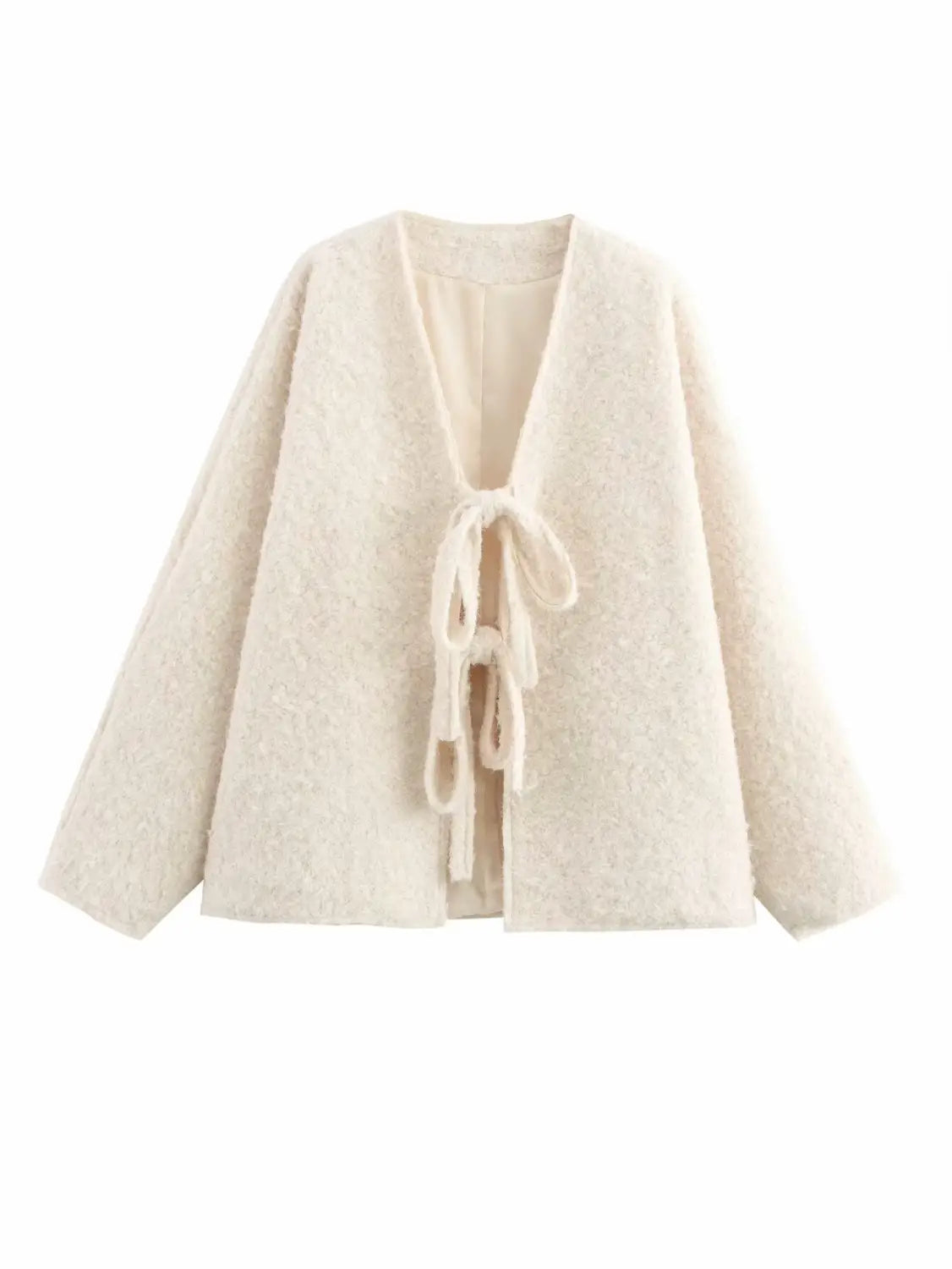 V-neck Cardigan Fashion Casual Lace Up Woolen Coat Short - Beige / L - electronic accessories