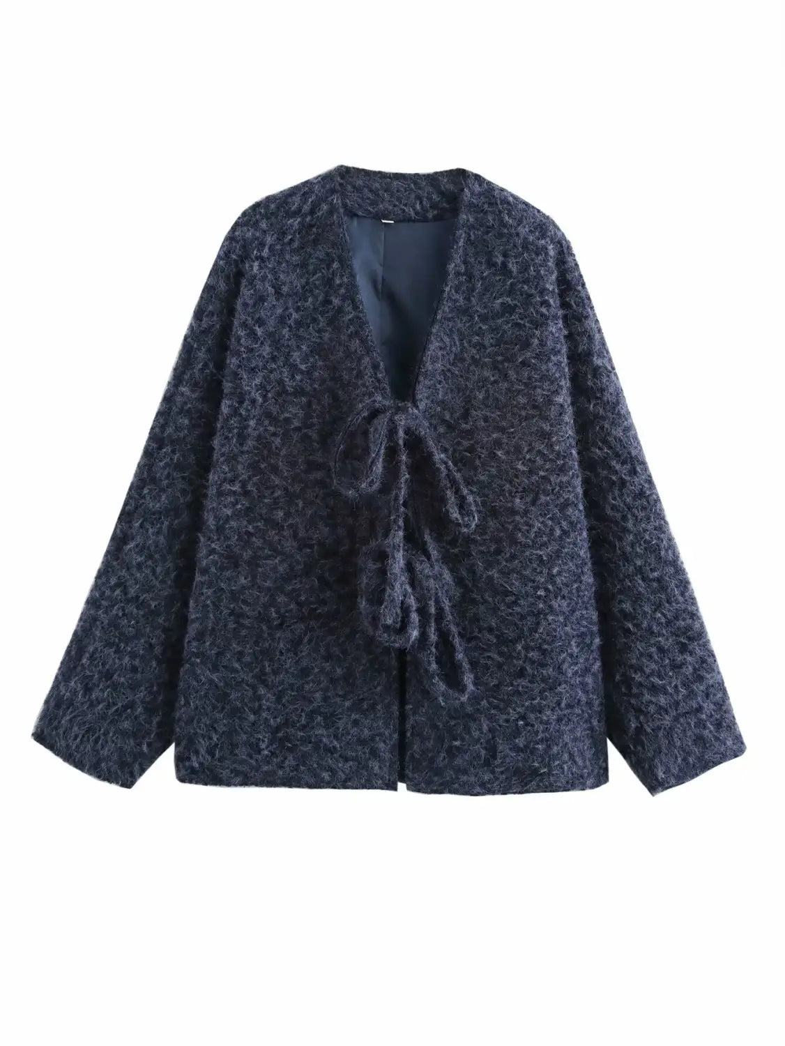 V-neck Cardigan Fashion Casual Lace Up Woolen Coat Short - Navy Blue / L - electronic accessories