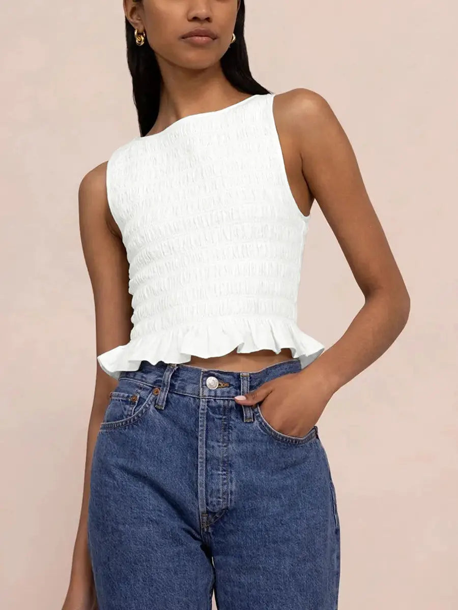 Women Frill Smocked Vest Sleeveless Shirred Ruffle Tank Top