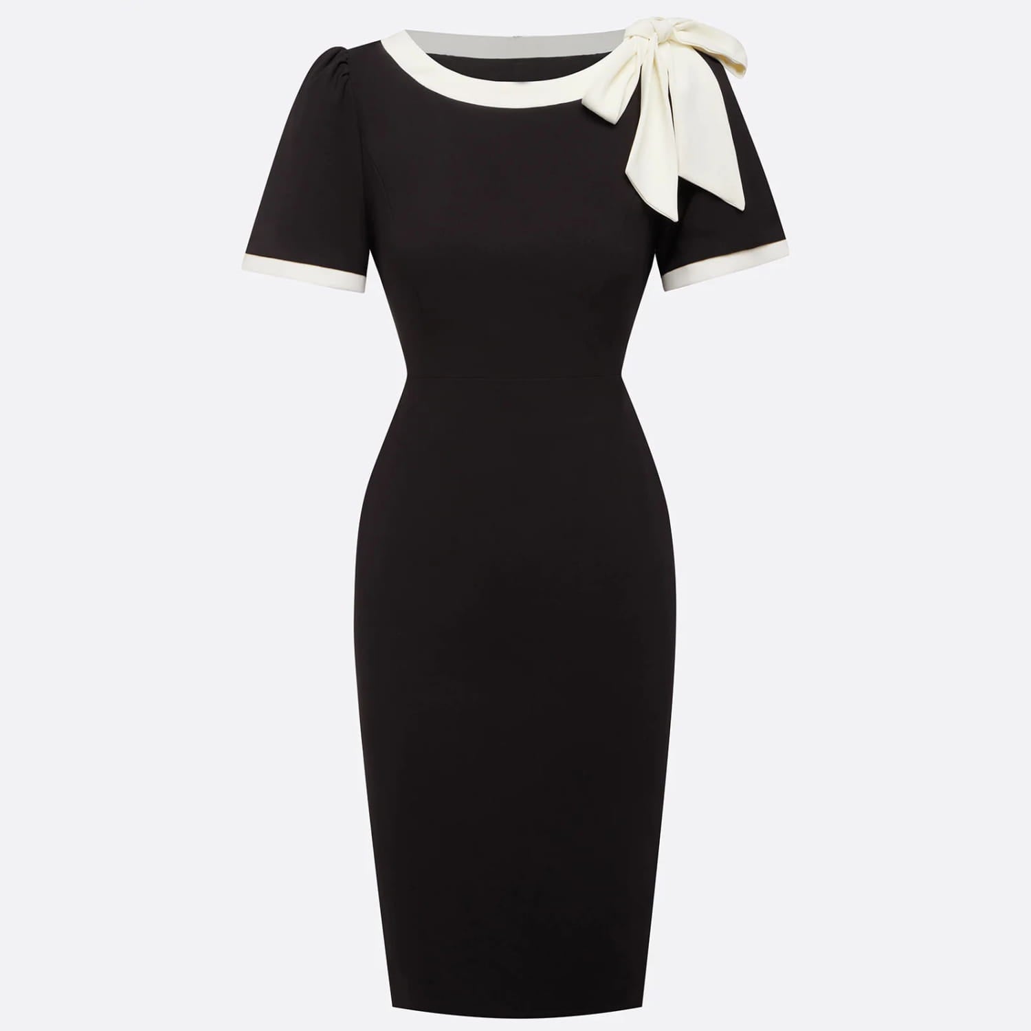 Women’s Clothing Round Neck Bowknot Contrasting-color Dress - Black / L - electronic accessories