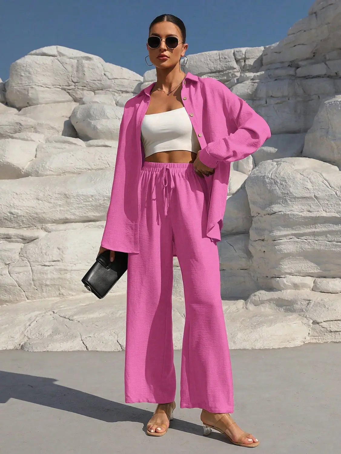 Women’s Long Sleeve Cardigan Two-Piece Set Casual Suit - Glittering Powder / L - electronic accessories
