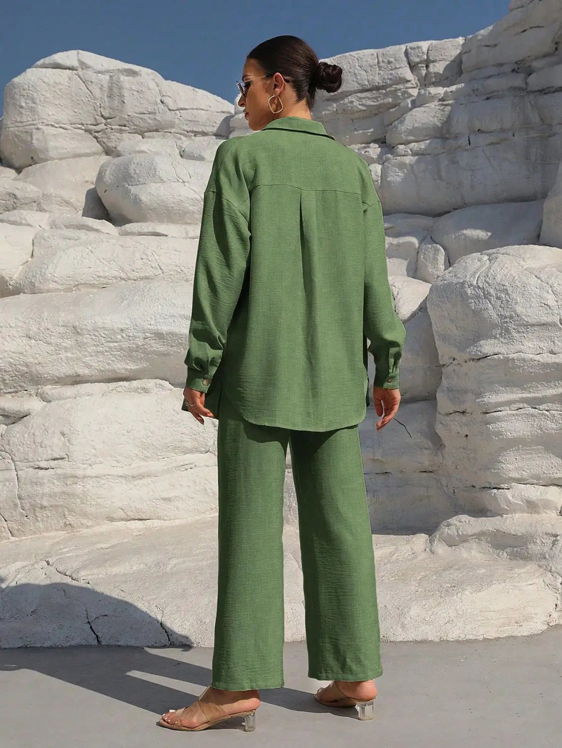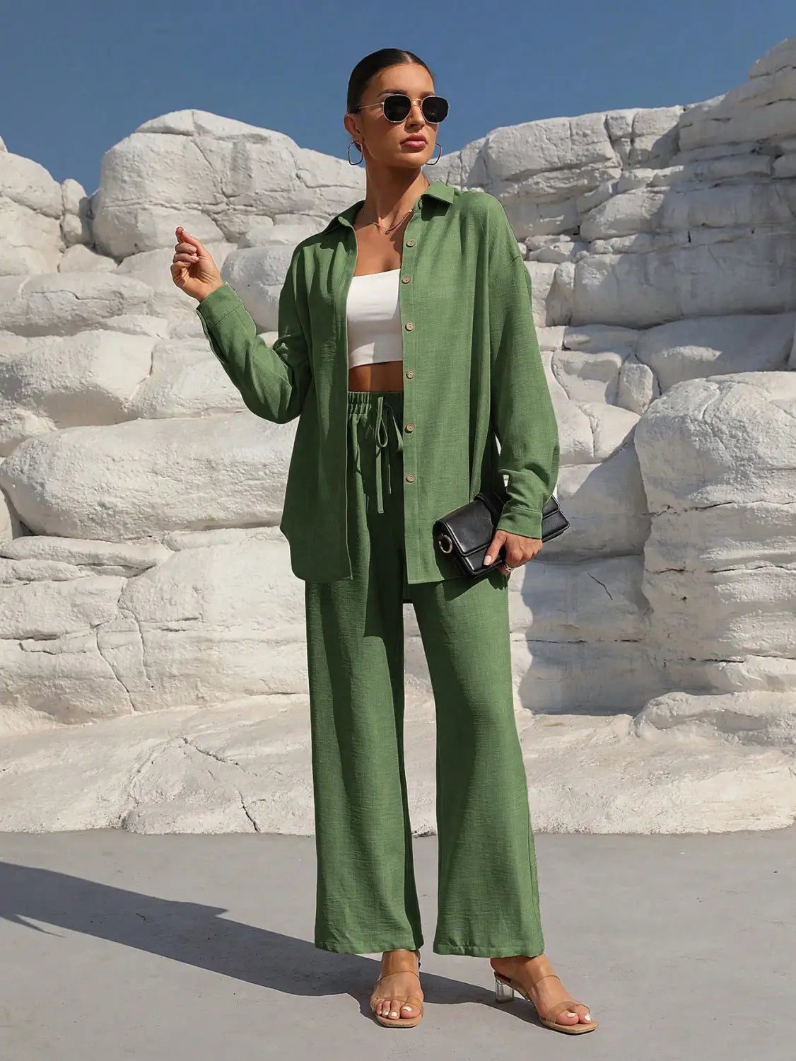 Women’s Long Sleeve Cardigan Two-Piece Set Casual Suit - Green / L - electronic accessories