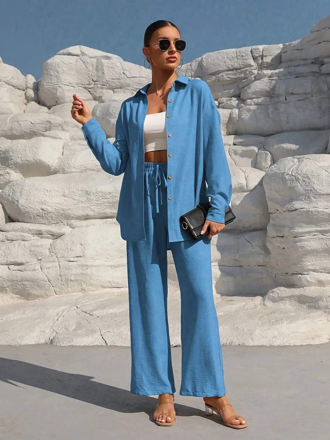 Women’s Long Sleeve Cardigan Two-Piece Set Casual Suit - Sea Blue / L - electronic accessories
