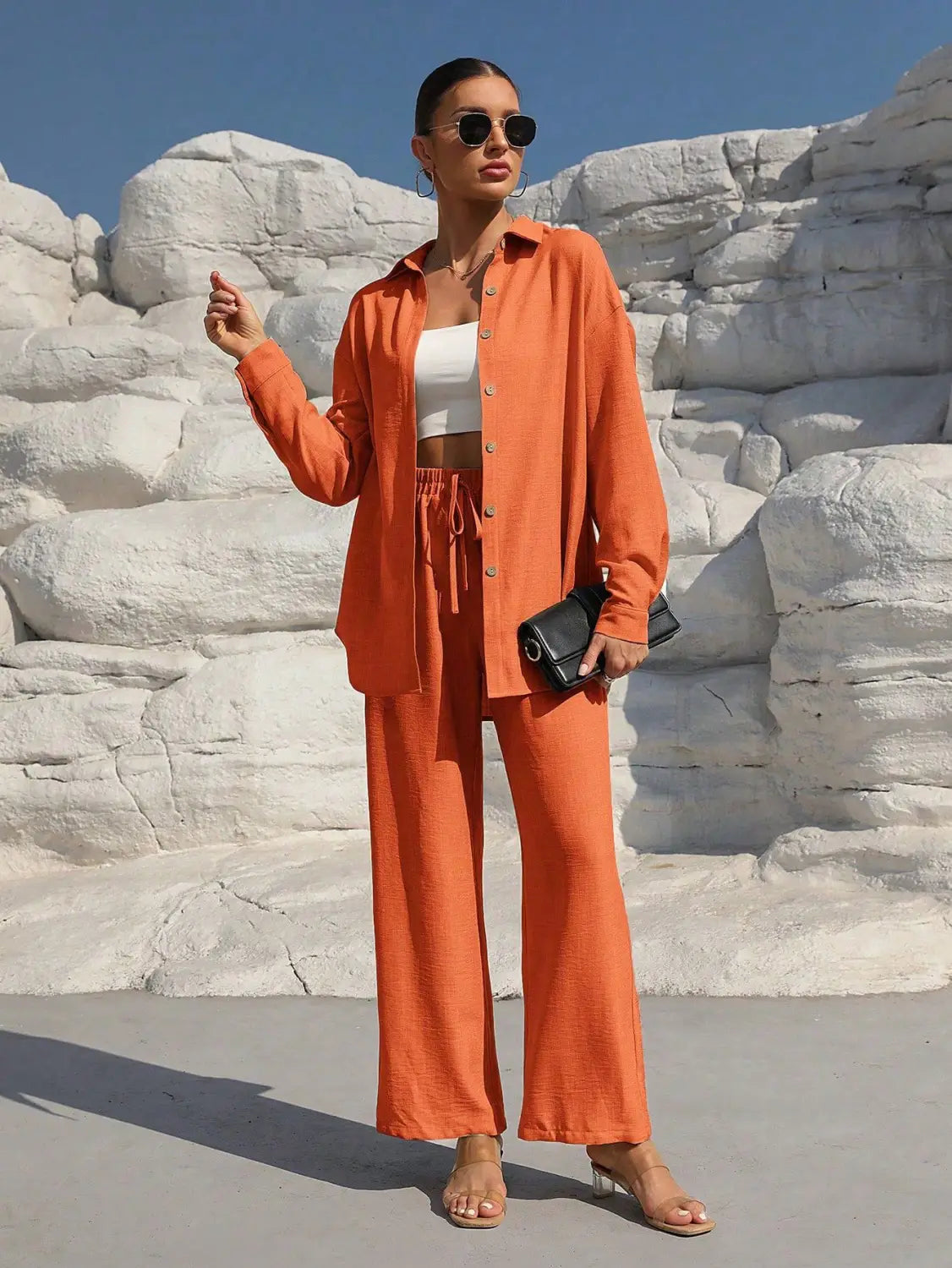 Women’s Long Sleeve Cardigan Two-Piece Set Casual Suit - Orange Red / L - electronic accessories