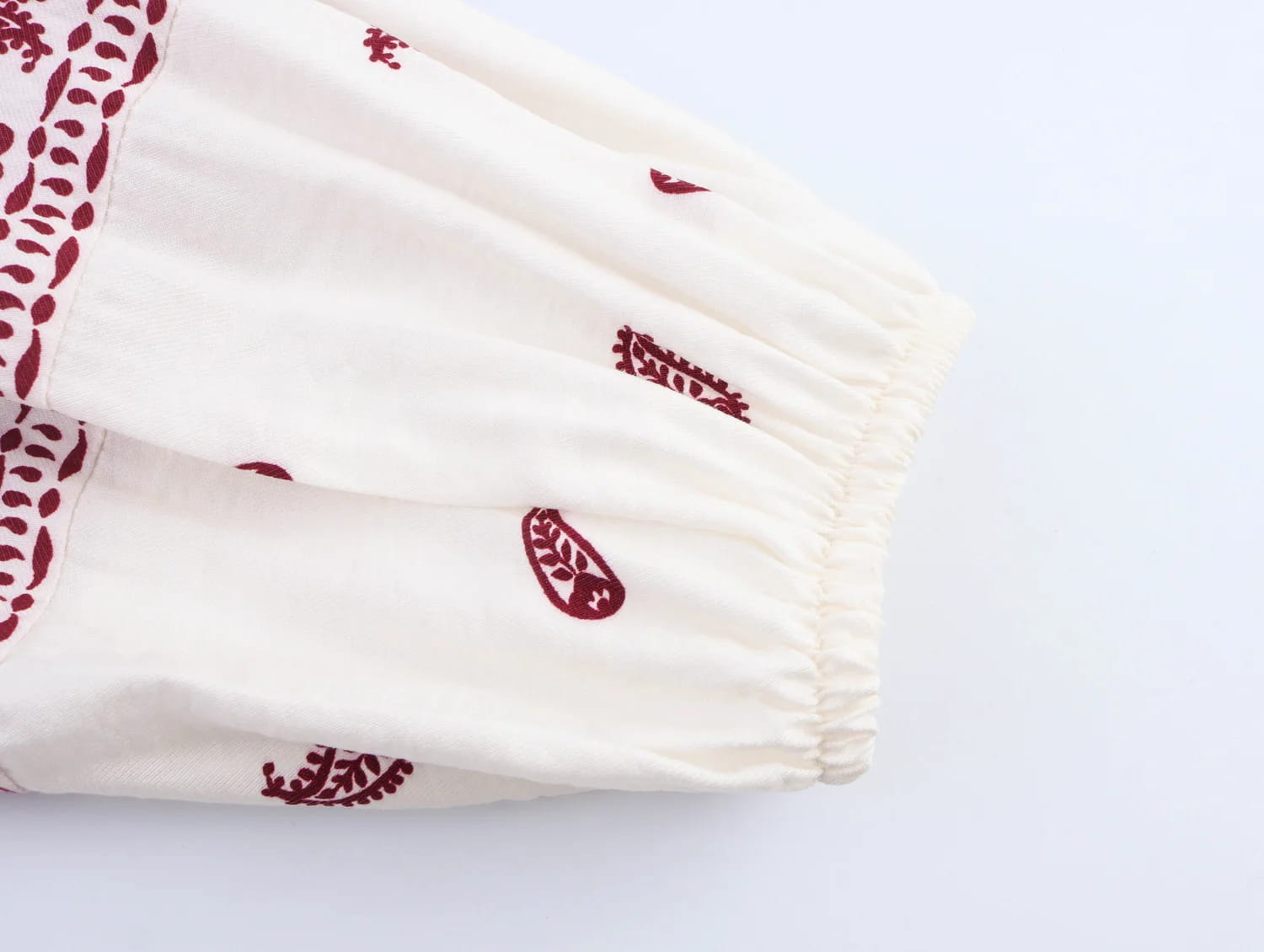 Dameskjorte med trykt dusk, hul, løs, ståkrage og lanterneermer