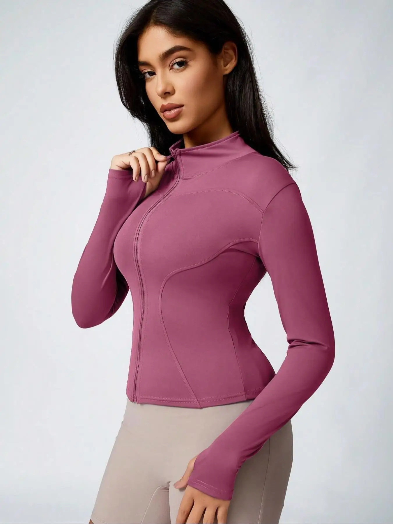 Brown cropped athletic jacket with mauve long-sleeve zip-up top